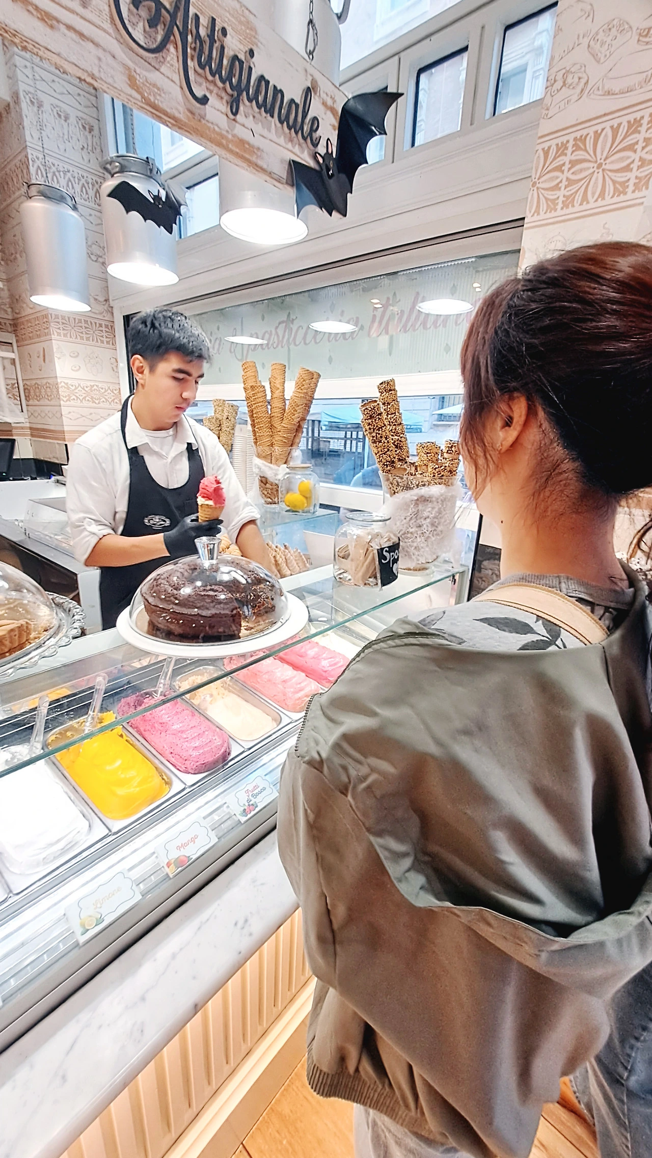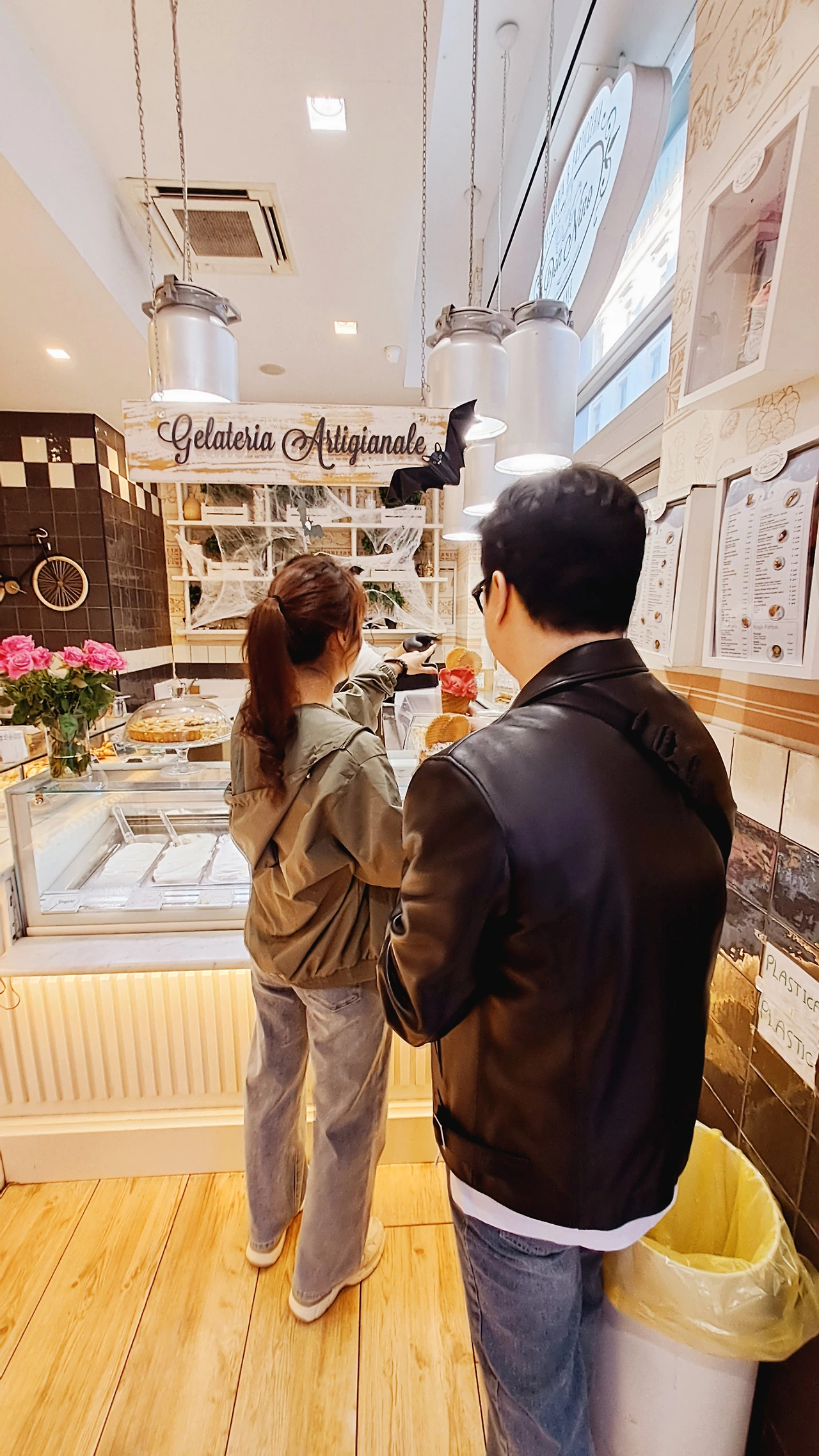 우리는 분수의 물안개를 얼굴에 맞으며 천천히 그 가게 쪽으로 걸어갔다. 가까이 다가가자 입구에서는 우유와 과일 향이 뒤섞인 달콤하고 부드러운 공기가 흘러나왔다. 유리창 너머로 보이는 젤라토의 결은 마치 막 저어낸 크림처럼 매끄럽고 부드러워 보였다.