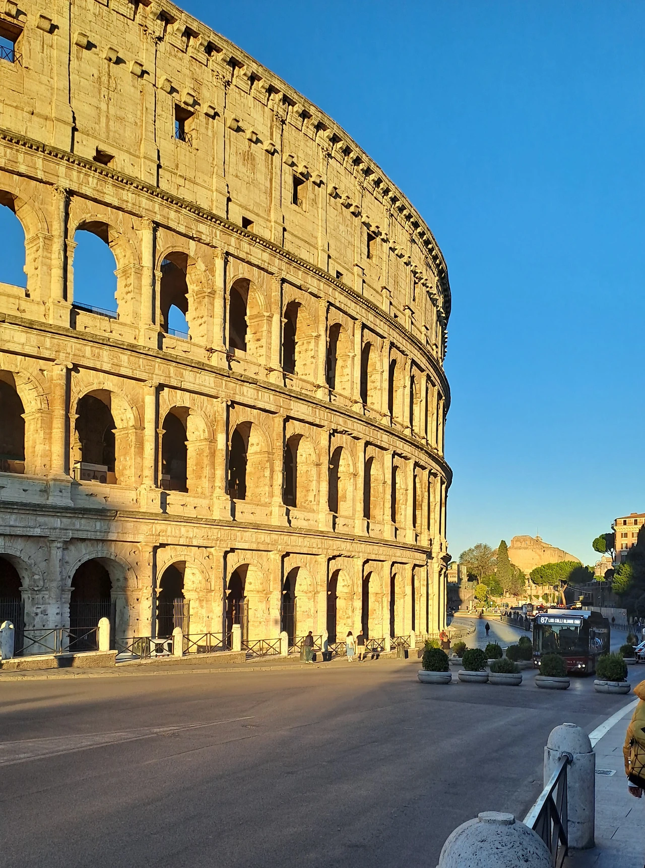 공원을 빠져나오는 순간, 갑작스럽게 시야에 콜로세움의 장대한 모습이 환하게 펼쳐졌다. 어젯밤에는 조명의 밝은 빛 아래에서 웅장함이 강조되었다면, 아침의 햇살 아래에서는 고대 아치 돌기둥들이 더 부드러운 색을 띠면서도 여전히 압도적인 존재감을 뿜어내고 있었다.