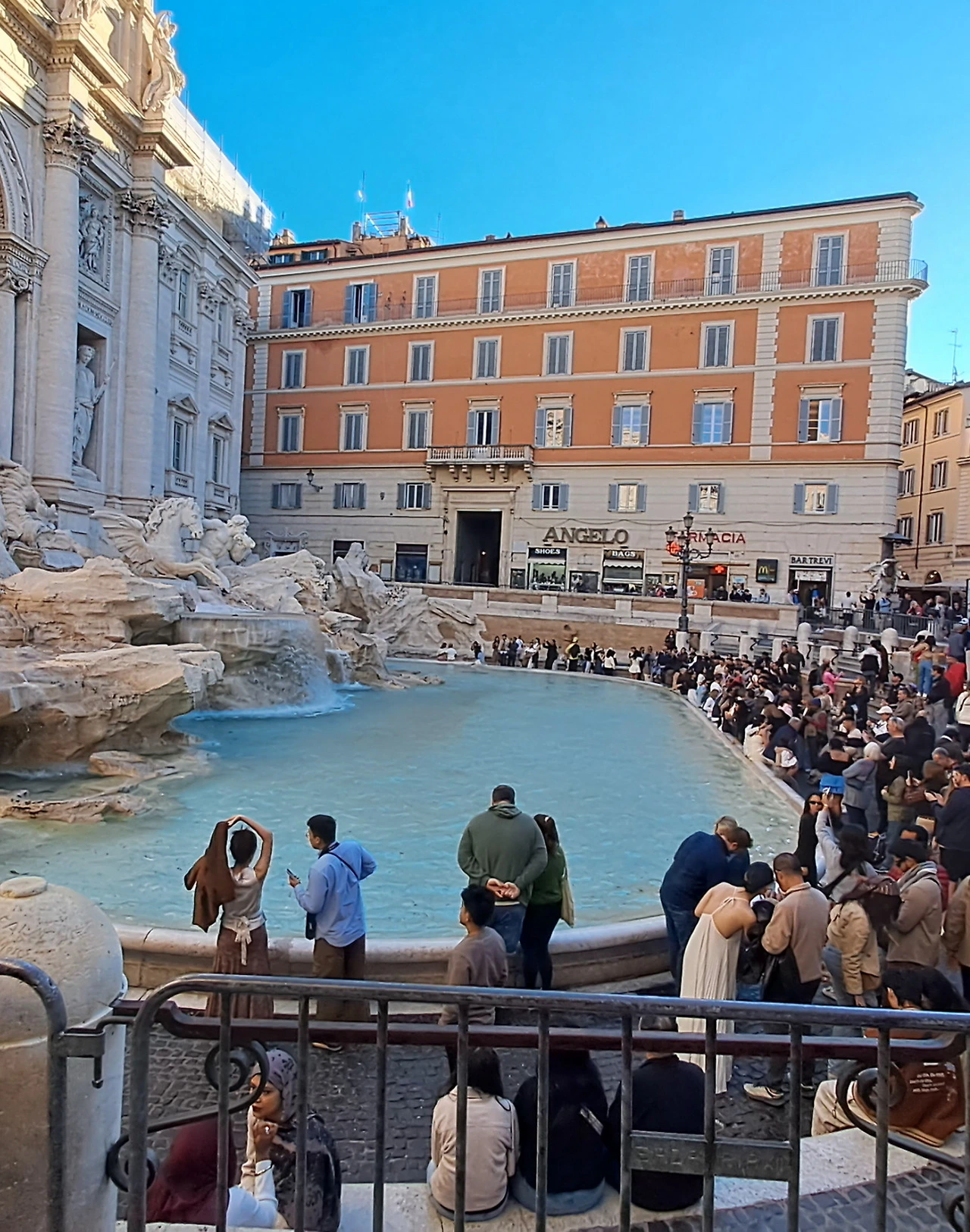 많은 여행자들이 이미 자리를 잡고 있었고, 분수 가장자리에는 사진을 찍거나 조용히 물결을 바라보거나 동전을 손에 쥐고 소원을 비는 이들이 보였다. 아침 햇살을 받아 흐르는 물줄기는 유난히 맑고 푸른빛을 띠었으며, 수많은 조각상이 만들어내는 음영과 곡선은 마치 살아 있는 생명체처럼 생생하게 움직이는 것 같았다.
