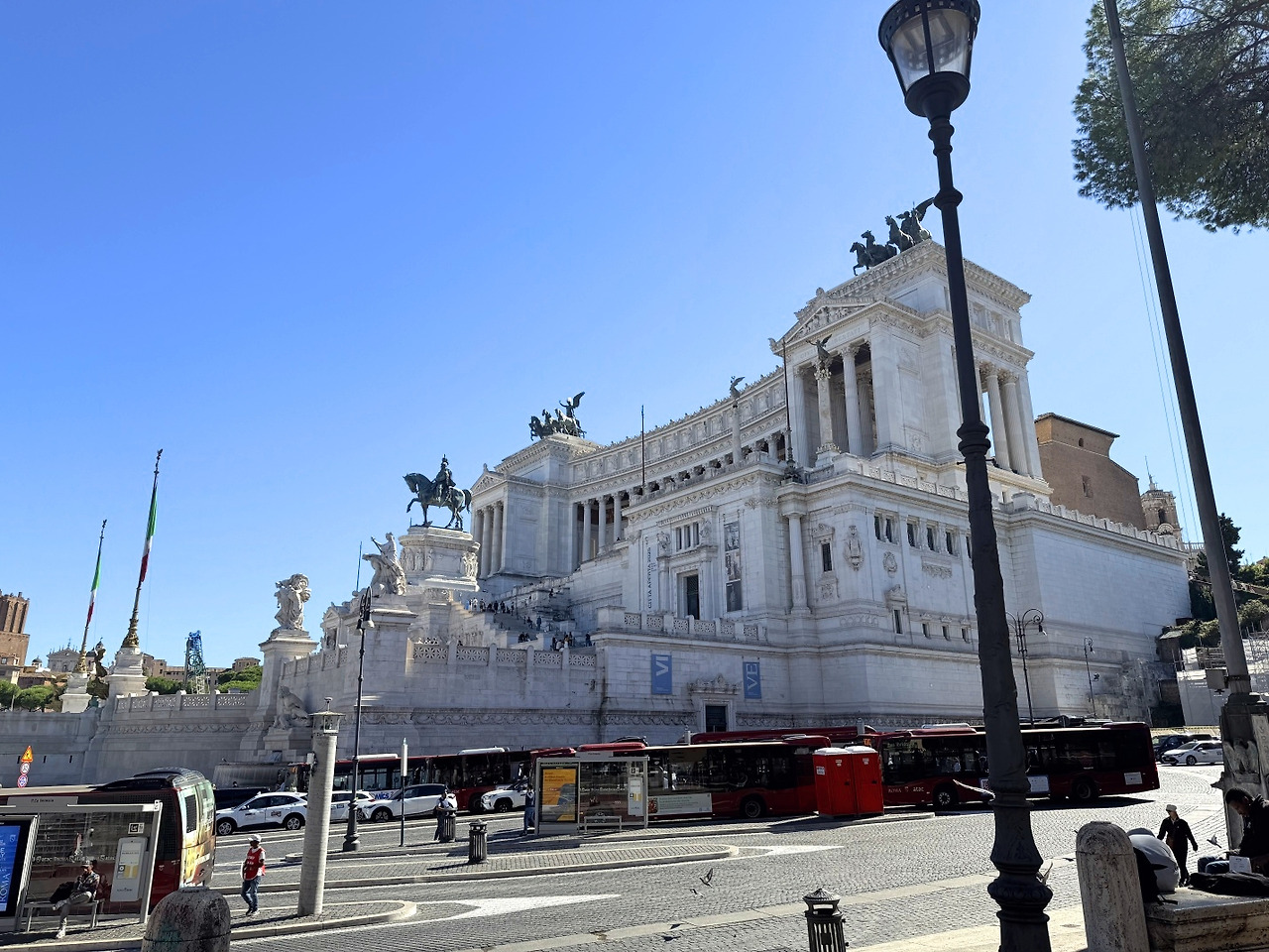 기념관을 지나자 도시의 풍경은 한층 더 역동적으로 변했다. 차량의 흐름은 끊임없이 이어졌고, 가이드 깃발을 따르는 관광객들의 줄이 길게 이어지며 분주한 박동을 형성했다. 사람들의 발걸음과 도로의 소리가 겹치며 로마의 살아 있는 리듬이 실시간으로 전해졌다.