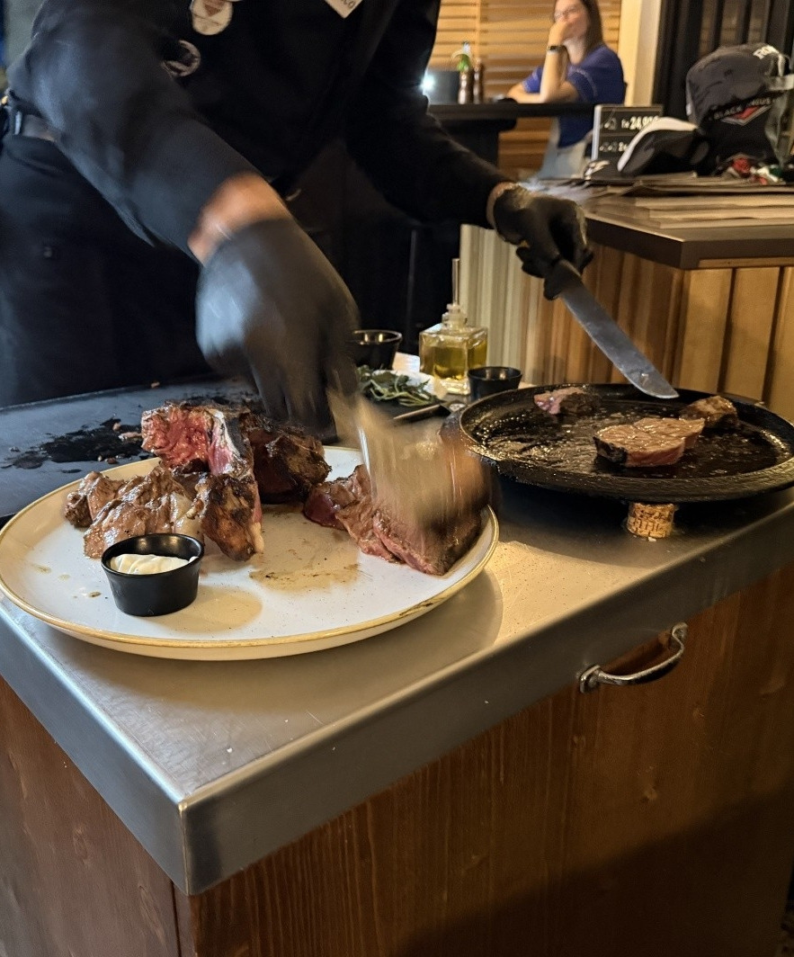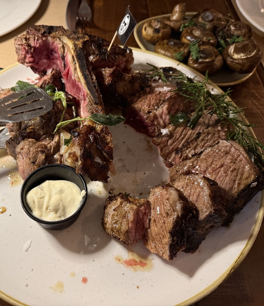 숙소에 잠시 들러 몸을 추스른 뒤, 우리는 아들이 미리 예약해 둔 스테이크집으로 발걸음을 옮겼다. 여행을 준비하면서부터 "로마에 가면 꼭 한 번은 먹어보라"는 이야기를 여러 번 들었다고 했다. 좁은 거리 끝에 자리한 가게는 외관은 소박했지만, 문 앞에 다가서자 이미 고소한 향이 흘러나오고 있었다. 식당 안에 들어서니 따뜻한 조명 아래에서 사람들의 웃음소리와 와인잔이 부딪히는 소리가 공간을 채우고 있었다.