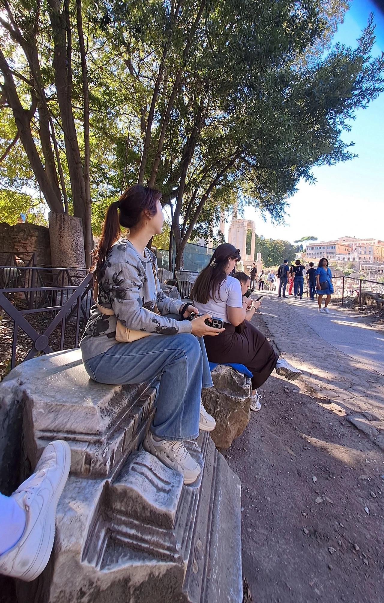 돌길은 예상보다 거칠었다. 울퉁불퉁한 돌 위를 걷다 보니 발바닥에 묵직한 통증이 전해졌다. 오래된 돌이 수천 년을 버텨온 흔적이, 걷는 이의 몸으로 그대로 전달되는 느낌이었다. 결국 우리는 잠시 그늘 아래에 앉아 쉬어 가기로 했다. 그늘에 몸을 맡기고 바람을 맞으며 숨을 고르니, 언덕 위에서 내려다보던 풍경과는 전혀 다른 고요가 주변을 감싸고 있었다. 위에서는 도시 전체가 한눈에 들어왔다면, 이곳에서는 시간 자체가 잠시 멈춘 듯 조용했다.