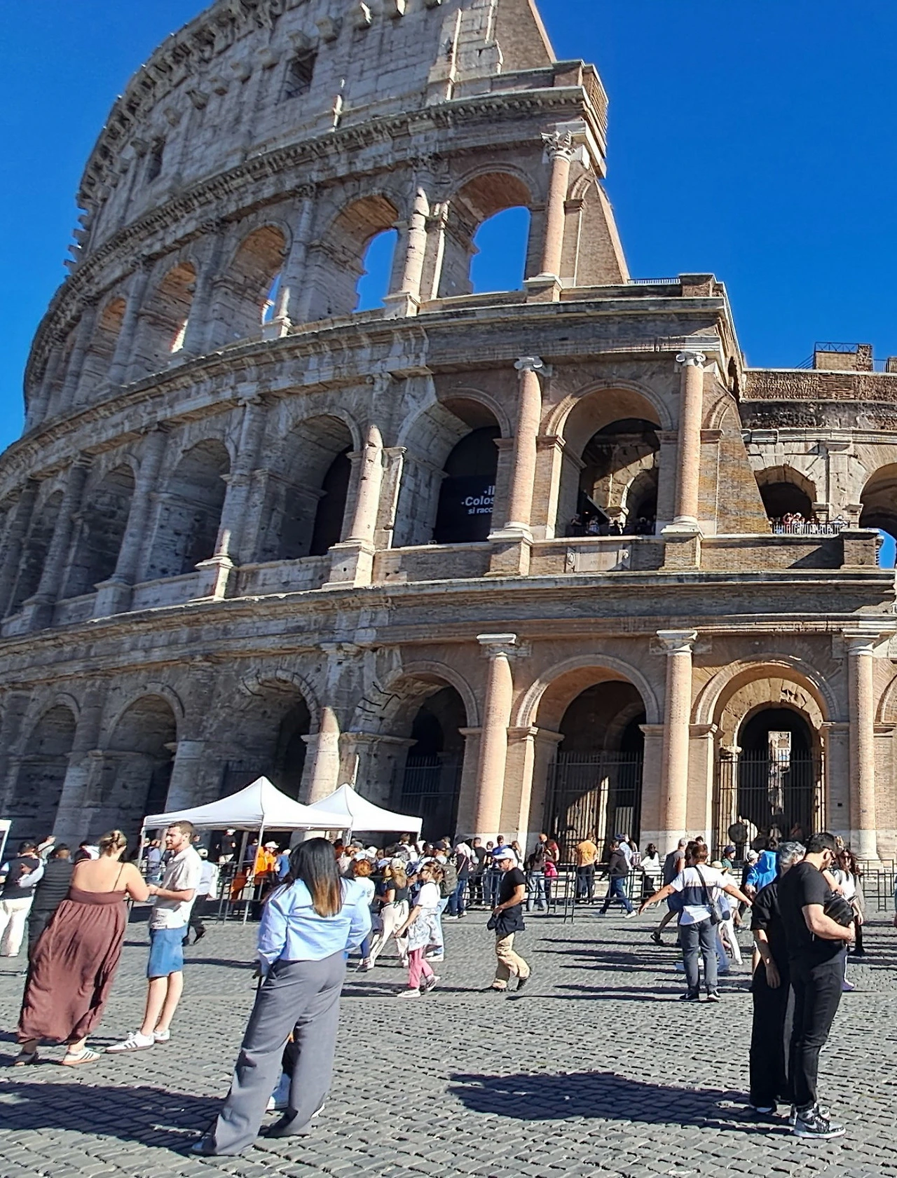 입구를 나오자마자 눈앞에 선명하게 우뚝 서 있는 그 모습은, 유적지 안쪽에서 바라보던 어느 장면보다도 강렬했다. 햇빛을 받아 더욱 또렷해진 콜로세움의 외벽은 로마의 역사와 힘을 그대로 품은 거대한 상징처럼 깊은 존재감을 뿜어내고 있었다. 멀리서 보던 인상과 달리, 가까이 다가갈수록 그 규모는 감각을 압도했다. 외벽을 따라 이어진 수많은 아치들은 햇빛을 받아 금빛과 붉은빛을 번갈아 내며 거대한 원형을 감싸고 있었고, 그 앞에서는 카메라 셔터 소리가 끊임없이 이어졌다. 여행객들은 각기 다른 각도에서 이 장면을 담아내느라 분주했지만, 그 분주함조차 이 건축물이 가진 힘 앞에서는 조용한 배경처럼 느껴졌다.