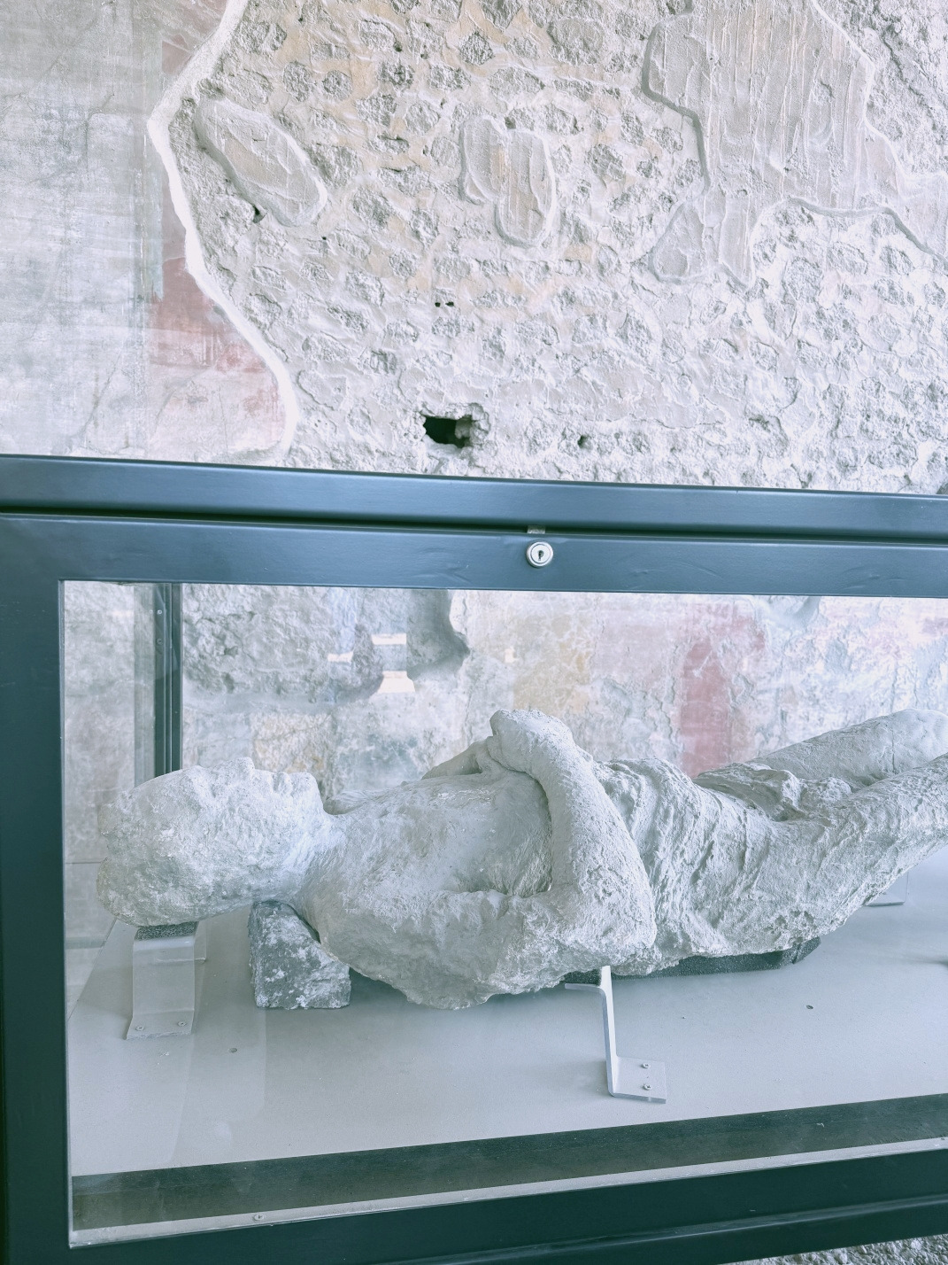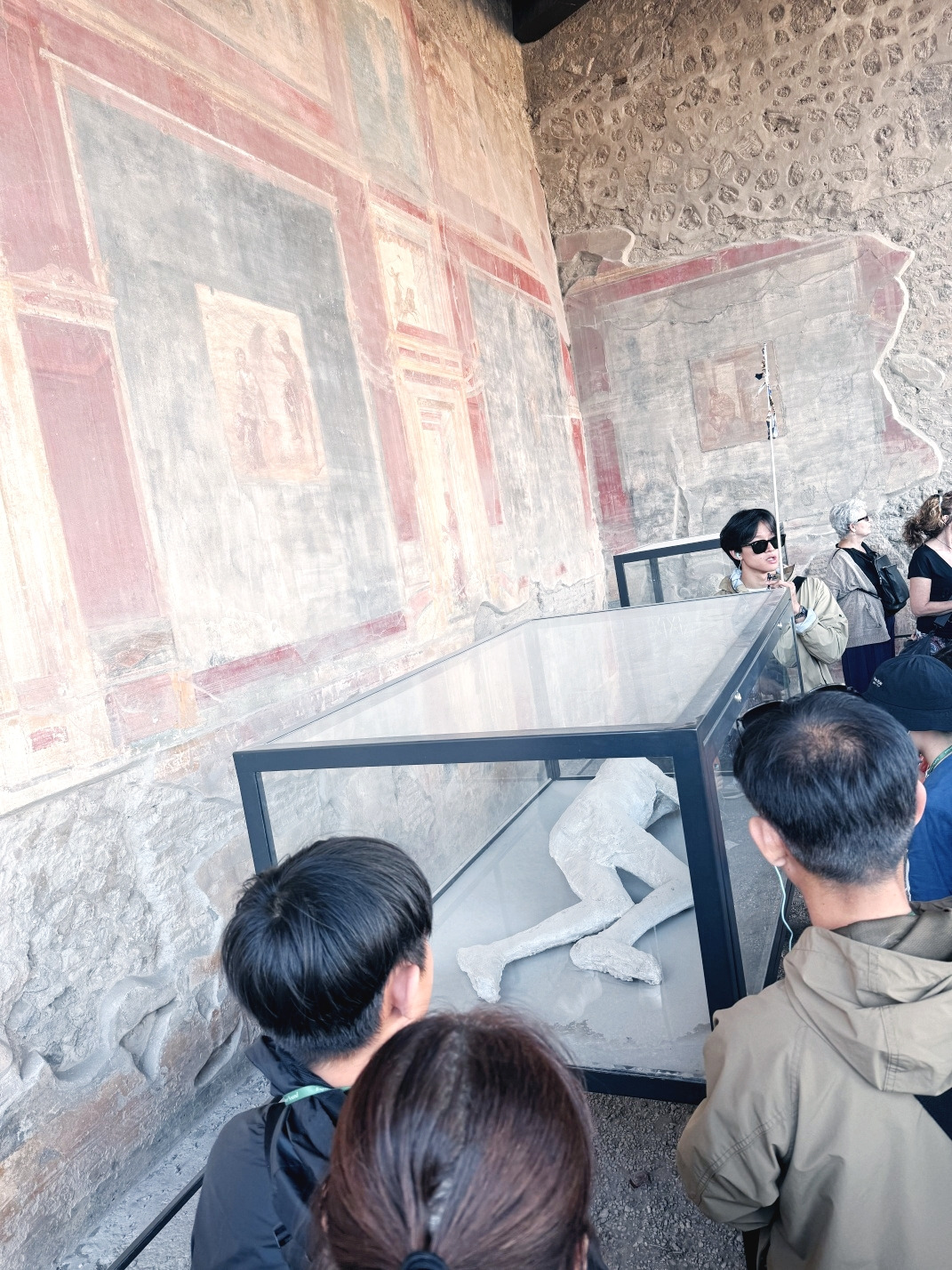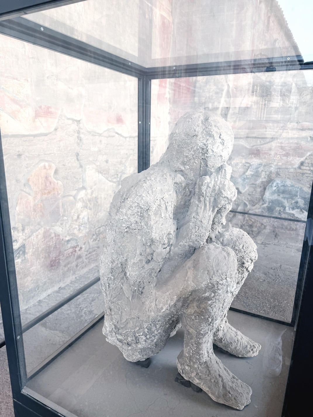 그 벽 아래, 유리 상자 안에는 석고 모형들이 놓여 있었다. 화산재 속에 남은 빈 공간에 석고를 부어 되살린 마지막 순간의 형상들이라고 했다. 처음에는 조형물처럼 보였지만, 한 걸음 가까이 다가가자 그것이 사람의 몸이라는 사실이 또렷해졌다. 엎드린 채 몸을 웅크린 사람, 두 팔로 얼굴을 감싼 사람, 옆으로 누운 채 멈춘 형상. 각기 다른 자세가 서로 다른 이야기를 품고 있는 듯했다.