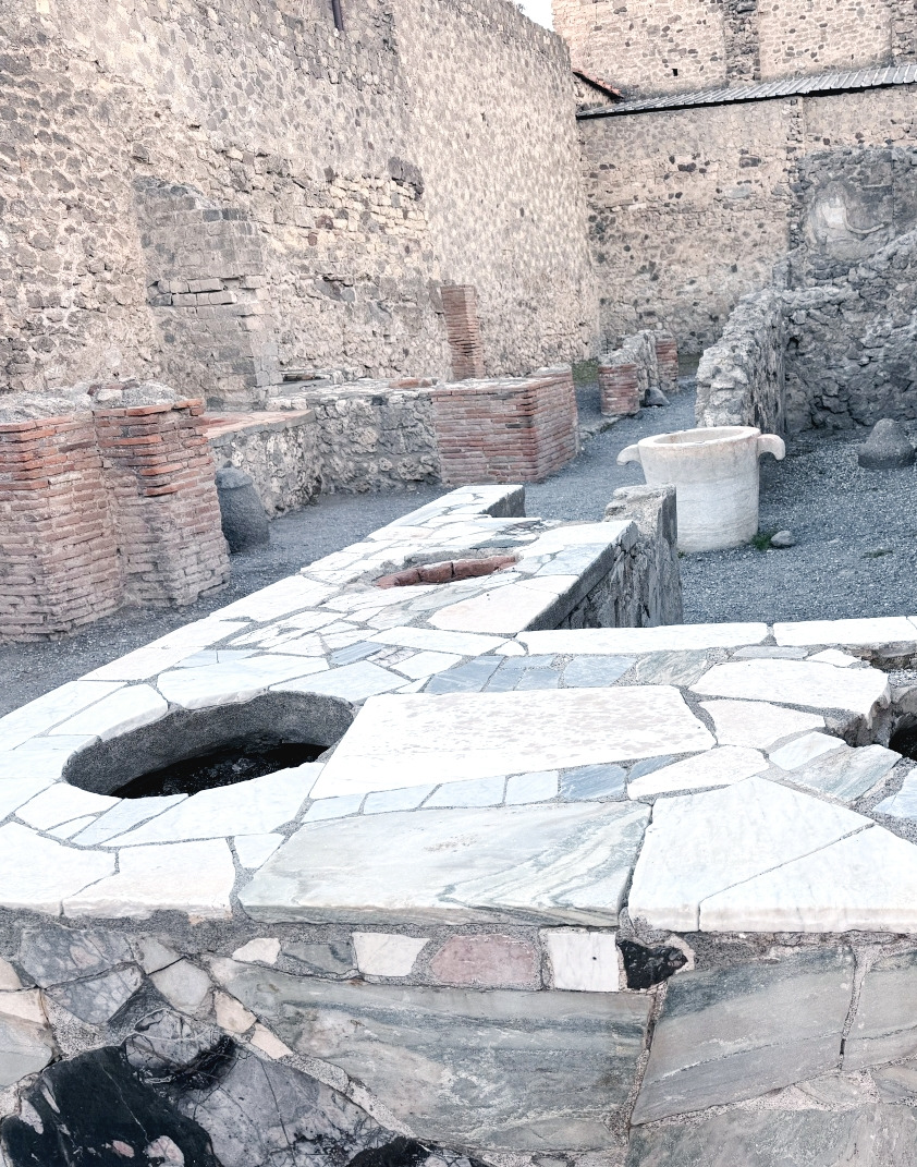 목욕탕을 나와 이어진 시장 터에 다다르자, 둥글게 파인 구멍이 일정하게 나 있는 대리석 상판이 눈에 들어왔다. 부뚜막처럼 이어진 구조는 언뜻 보아도 음식과 관련된 공간임을 짐작하게 했다. 그 둥근 자리마다 솥단지가 걸려 있었을 것이다. 깊은 냄비 안에서 음식이 보글보글 끓고, 김이 피어오르며 길을 지나는 사람들을 불러들였을 장면이 떠올랐다.