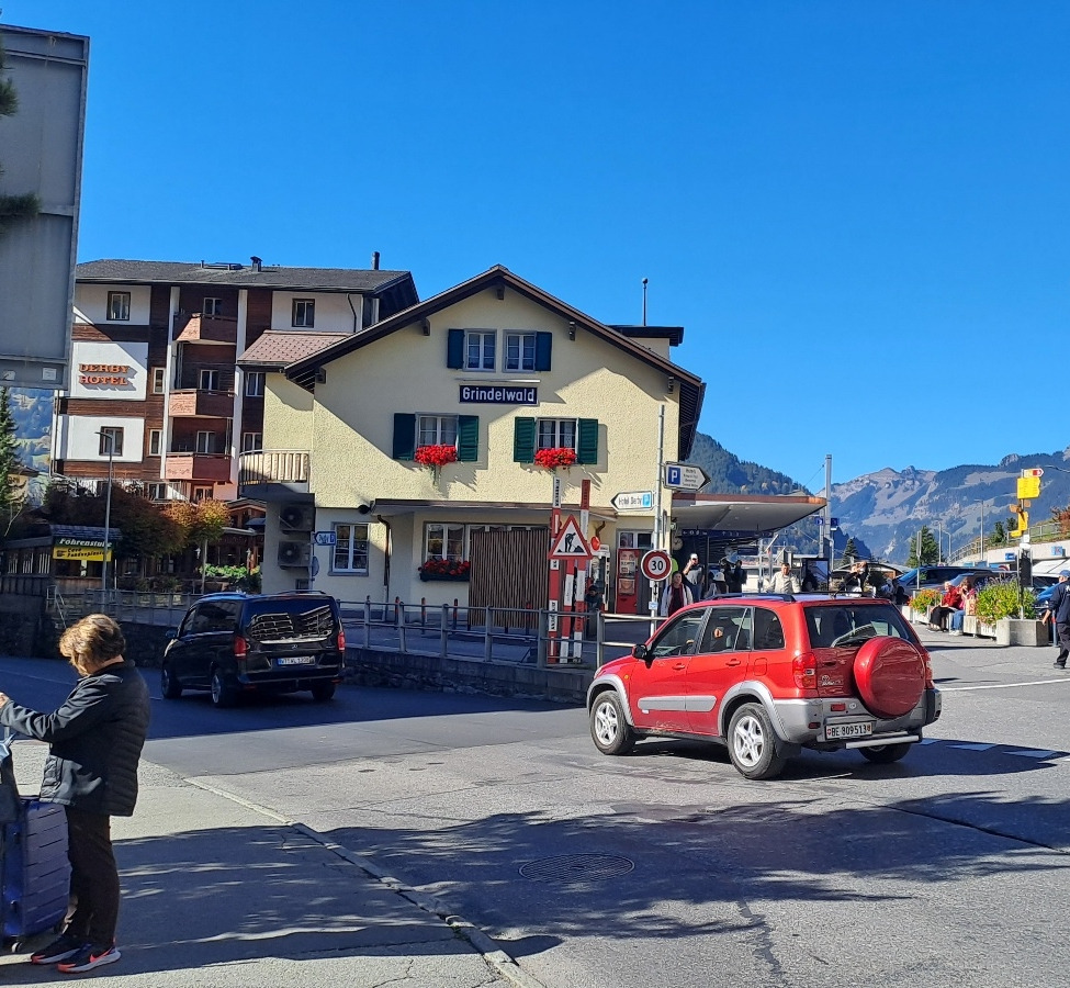 그린델발트 중심지로 향해 차를 몰고 가는 길목에는 역이 자리하고 있어, 자연스럽게 철도 건널목 앞에 이르게 되었다. 마침 기차가 지나가고 있어 우리는 차를 세운 채 잠시 기다려야 했다. 그 짧은 멈춤 속에서도 시선은 분주히 움직였고, 머리 위로는 곤돌라가 끊임없이 오르내리고 있었다. 공중을 가로지르는 그 모습은 이곳 사람들에게는 일상이겠지만, 우리에게는 낯설고도 인상적인 풍경으로 다가왔다. 그린델발트 터미널에서 아이거글레처까지 이어지는 이 곤돌라는 융프라우로 오르는 가장 빠르고 편리한 길이라 많은 사람들이 이용하는 듯 보였다.