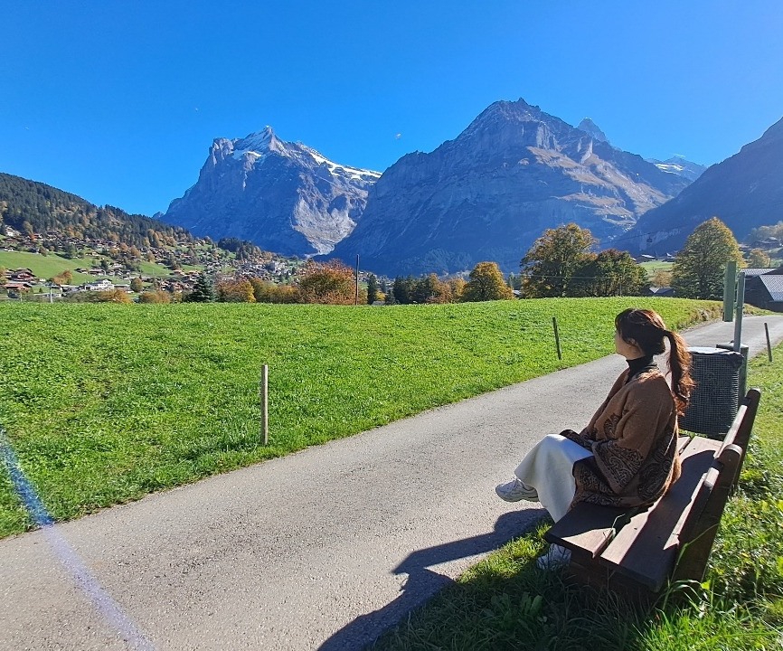 멀리 아이거 북벽을 배경으로, 벤치에 앉아 건너편 마을을 바라보고 있는 딸의 모습이 눈에 들어왔다. 그 모습은 풍경 속에 자연스럽게 스며들어, 마치 한 장의 그림처럼 고요하고도 또렷하게 다가왔다. 우리가 서 있는 이곳 그린델발트는 양쪽 능선을 따라 전통 가옥인 샬레들이 점점이 자리하고 있었고, 그 배치는 어느 한쪽으로 기울지 않은 채 절묘한 균형을 이루며 하나의 완성된 풍경을 만들어 내고 있었다. 우리는 중심 시가지로 이동하기 위해 차에 올랐다. 운전은 딸이 맡았고, 차는 조용히 길을 따라 움직였다. 목적지까지는 불과 5분 남짓, 짧지만 그마저도 아깝게 느껴질 만큼 주변 풍경은 계속해서 시선을 붙잡고 있었다.