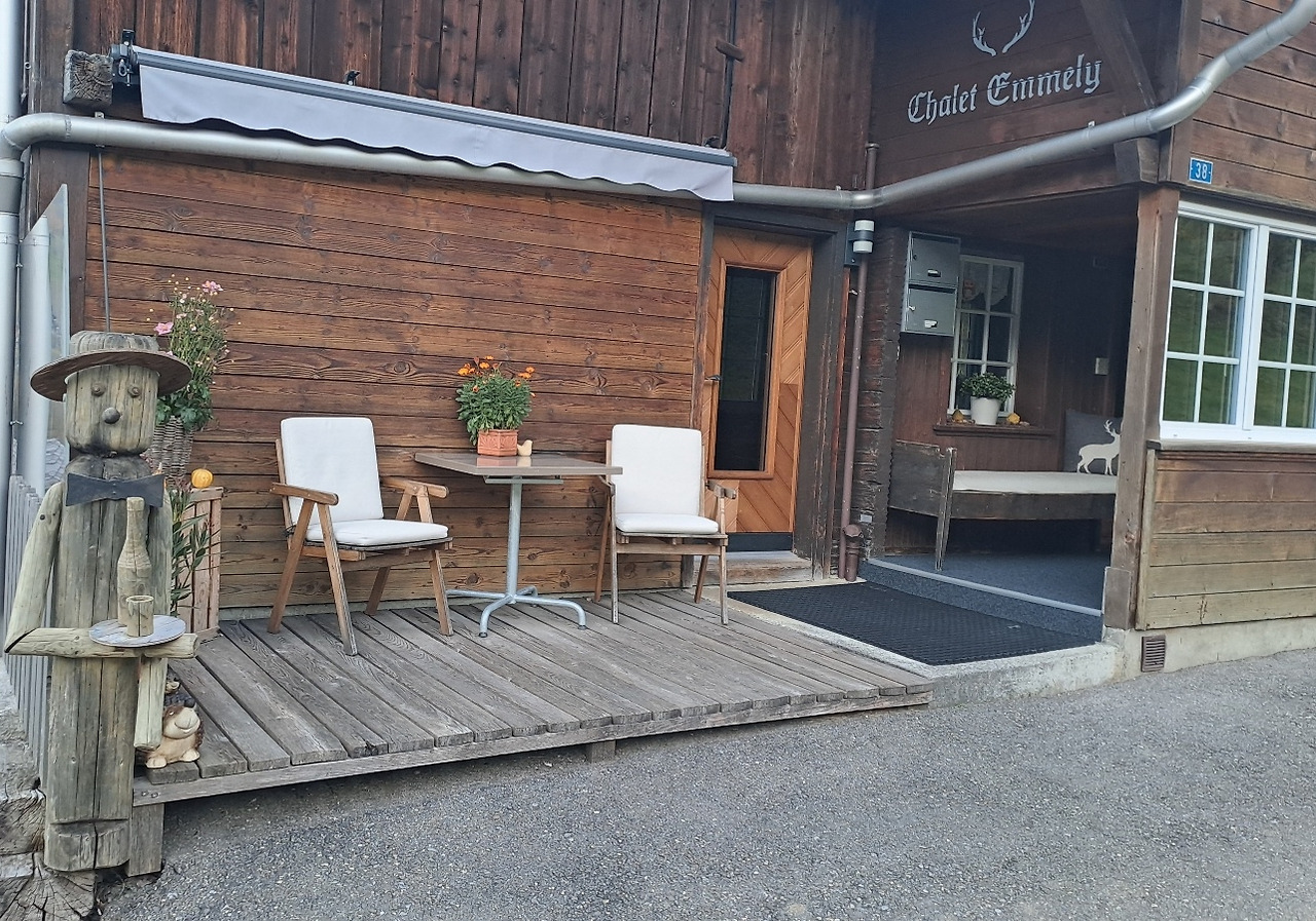 가을의 스위스 하늘에는 한때 하얀 구름이 머물며 풍경을 잠시 가리고 있었지만, 이내 그것이 흘러가고 청명한 하늘이 다시 모습을 드러냈다. 푸른 초원을 바탕으로 저 멀리 설산이 서서히 시야에 들어왔고, 그 풍경은 한 폭의 그림처럼 또렷하게 펼쳐졌다. 우리가 걷는 길 양옆에는 소들이 목에 단 종을 은은하게 울리며 한가로이 풀을 뜯고 있었는데, 그 잔잔한 소리는 마치 시간의 흐름마저 느리게 만드는 듯했다. 우리는 숙소인 샬레를 배경으로 몇 장의 사진을 남겼고, 입구에 놓인 의자와 탁자에 앉아 한동안 아무 말 없이 그 풍경을 바라보았다. 그곳에는 나무로 깎아 만든 사람 모양의 조각 하나가 서 있었는데, 마치 이곳을 찾는 이들을 조용히 맞이하는 수호자처럼 느껴졌다.