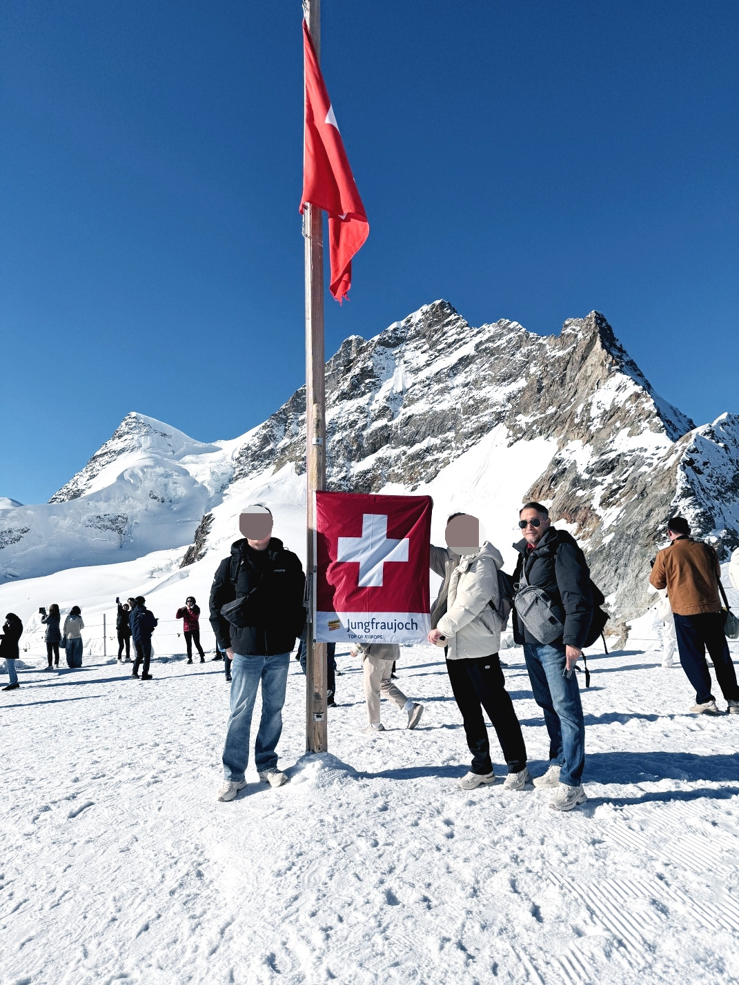 우리도 어느 한국분께 실례를 무릅쓰고 부탁하여, 파란 가을 하늘 아래 선명하게 휘날리는 붉은 스위스 국기 밑에서 가족사진과 동영상을 남겼다. 발아래로는 하얀 구름바다가 시야를 살짝 가리고 있었지만, 오히려 그 덕분에 오로지 우리 눈앞의 설산과 빙하만이 온 세상을 차지한 듯 더욱 장엄하게 다가왔다.
