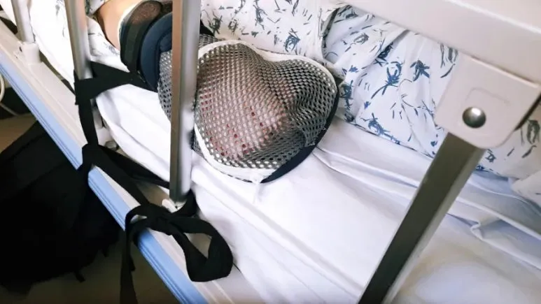 양쪽 손이 침대에 묶여 있고, 입에는 산소마스크가,