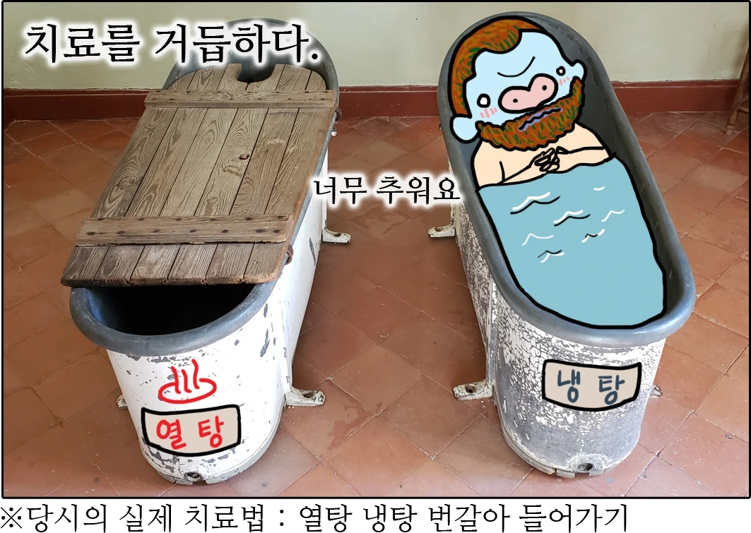 지금 생각하면 다소 어이없는 치료법이지만.. 당시에 열탕 냉탕 치료는 (와인 처방과 더불어서) 정신 질환에 대한 나름 진지한 치료 행위였다. 생레미 정신병원에서의 이런 치료가 효과가 있었던 것일까? 빈센트는 점차 나아졌고. 다시 그림을 그릴 수 있게 됐다. 처음에는 바깥출입이 자유롭지 못했던 탓에 병실에서 쇠창살 너머 풍경을 그리거나, 유명한 다른 작품의 모작을 많이 그렸다. 점차 나아지면서는 병원 부지 안 정원에서, 그리고 병원 바깥에서도 그림을 그리는 것을 허락받게 되었다.