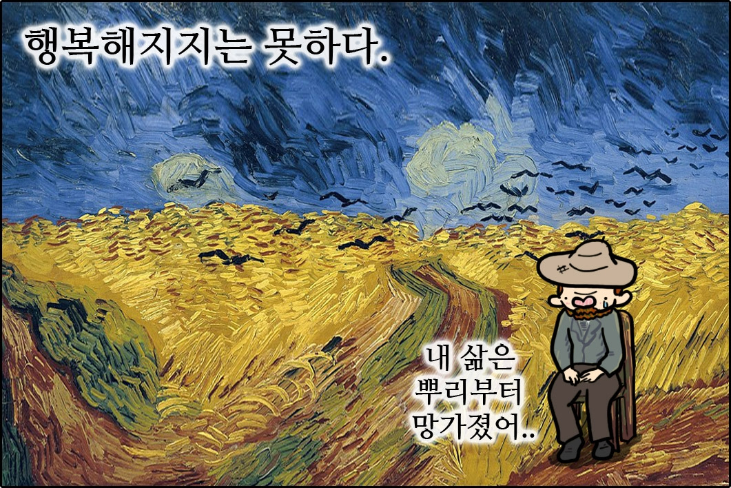 오베르의 밀밭을 그리고 보낸 편지에서는 그림을 그리며 우울함을 이겨내 보려는 빈센트의 노력이 느껴진다. 그러나 농촌을 보며 느꼈다는 ‘활기차면서 안심되는 느낌(healthy and fortifying)’은 빈센트의 마음을 다잡기에는 역부족이었던 듯하다. 그의 흔들리는 마음은 이미 걷잡을 수 없었다.