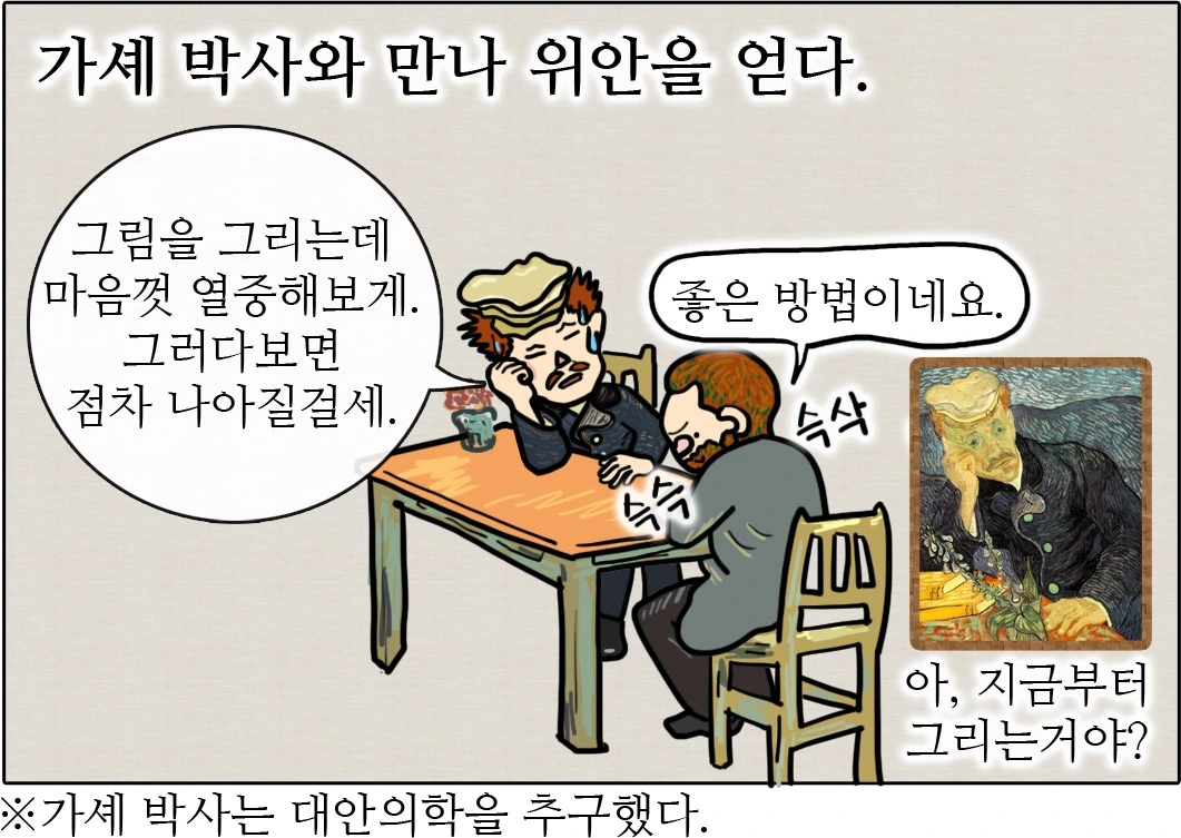 닥터 폴 가셰(Paul Gachet)는 의사이면서 동시에 아마추어 화가이기도 했기 때문에 마음이 불안정한 화가에게는 더없이 좋은 의사였다. 빈센트는 곧 가셰 박사와 친해졌다. 대체의학을 믿었던 가셰 박사는 빈센트에게 그림에 집중하는 것이 치료의 일환이 될 수 있다고 했고, 빈센트는 이에 충실히 따랐다. 오베르의 밀밭, 가셰 박사의 정원, 오베르의 교회 등 만나는 사람과 찾아간 장소 어디든 그림으로 남겼는데, 하루에 하나씩 작품을 만들어낼 정도로 열심이었다. 가셰 박사의 처방이 옳았던 것일까? 빈센트의 마음에도 볕이 드는 듯 보였다.