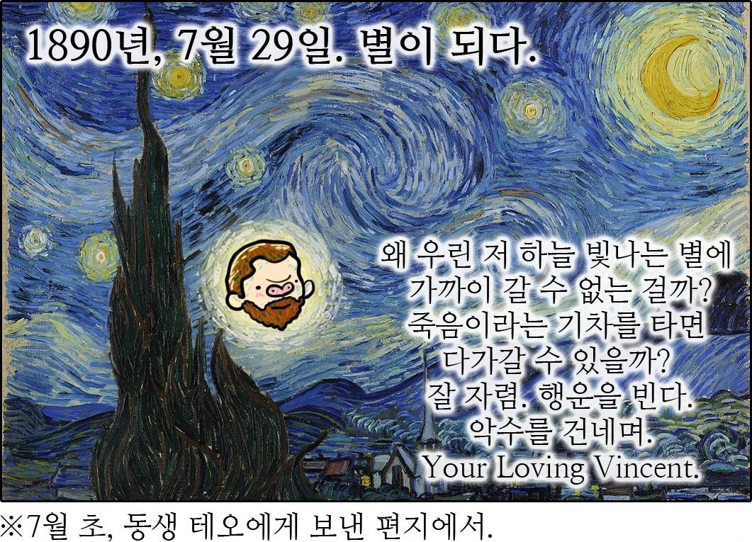 1890년 7월 29일, 빈센트는 언젠가 편지에서 얘기했던 "죽음이라는 기차"를 타고서 그리도 바라던 별로 떠났다. 그리고 빈센트 반 고흐와 그의 그림은 별이 되었다. 오늘의 우리는 그가 밤하늘 별을 바라보던 눈으로 그의 그림을 바라보고 있다. 하늘의 별 만큼이나 오래도록 남아 빛을 내는 화가의 삶과 그림을.