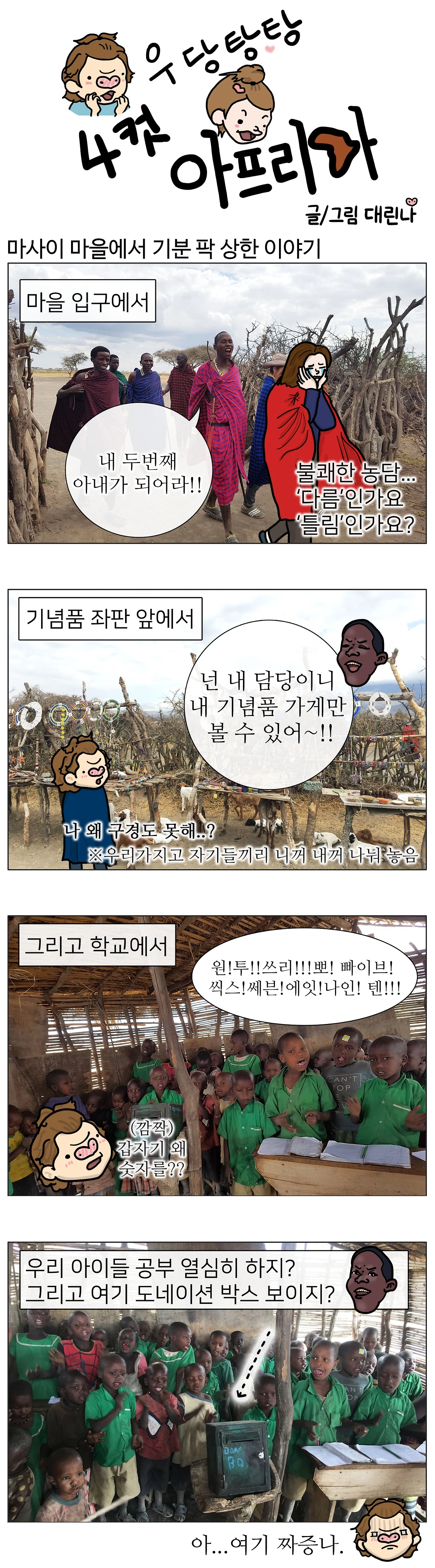 하는 생각에 화가 치밀었다. 이렇게 세팅된 학교 구경에는 채 5분이 걸리지 않았다. 이 얼마나 목적이 뚜렷한 노골적인 행사였단 말인가. 마사이 부족의 전통적인 마을을 구경한다는 기대감은 이미 사라진 지 오래다.ㅂㄷㅂㄷ