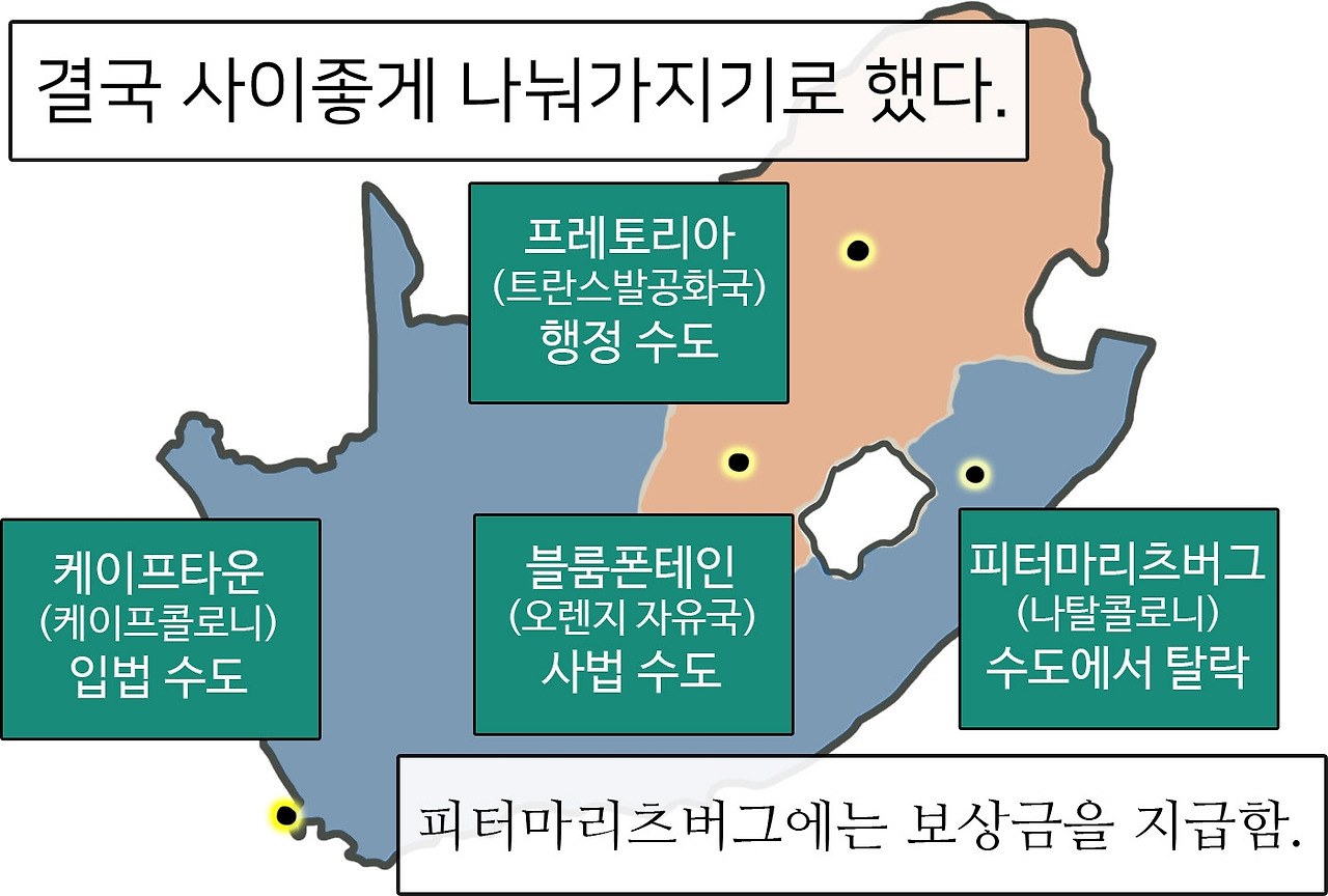 그래서 결국 수도를 나누어 가지기로 했다. 그렇게 남아공에 세 개의 수도가 생겨나게 된 것다. 수도의 기능을 행정, 입법, 사법으로 나누어 행정수도 프레토리아, 입법수도 케이프타운, 사법수도 블룸폰테인을 정했다. 민주주의의 삼권분립 개념이 아니었다면 이 연합은 실패하지 않았을까 하는 생각이 들 정도로 명분이 아슬아슬하게 맞아 떨어진 느낌이다. 영국령 나탈 콜로니의 수도 피터마리츠버그는 금전 보상을 받았다. 그리고 사법수도에 만족하지 못한 블룸폰테인도 보상을 받았다.