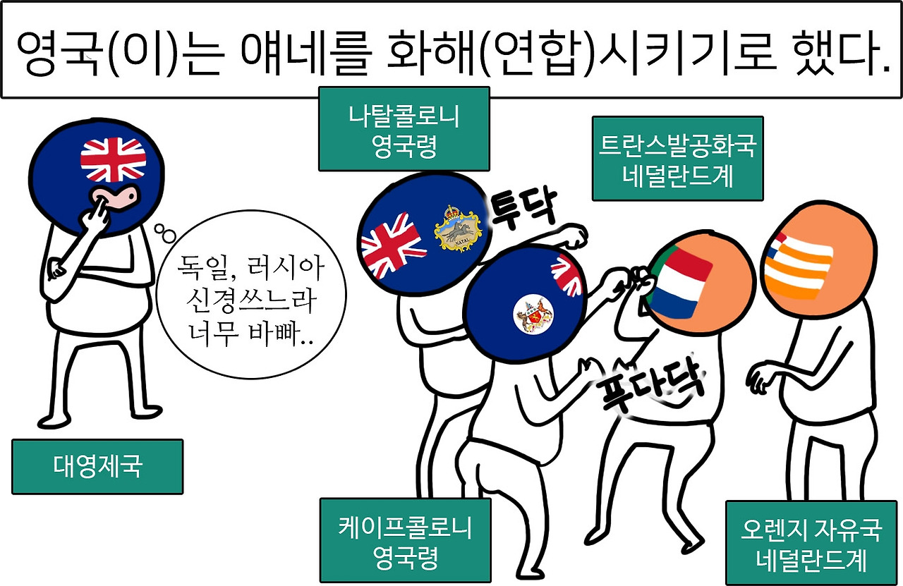 1900년대 초까지만 해도, 남아공은 통일된 하나의 나라가 아니었다. 당시 크게 네 개의 정치체로 이루어져 있었는데, 영국 식민지였던 케이프콜로니와 나탈콜로니, 네덜란드 보어인의 독립국이었던 트란스발공화국, 오렌지자유국이 주인공이었다. 트란스발과 오렌지 자유국 두 나라는 영국보다 먼저 남아공을 개척(?)한 네덜란드계 보어인들이 세운 공화국이었다. 이들은 19세기 중반에 영국에게 케이프타운을 빼앗기고 쫓겨나면서 내륙쪽으로 삶의 터전을 옮기게 되었다. <Groot Trek, 위대한 여정 으로 불림>. 이 보어인들이 남아공 내륙지방으로 이동하면서 또 트란스발공화국과 오렌지자유국으로 나뉘었는데, 둘 다 국제 사회의 승인을 받았던 어엿한 공화국이었다.
