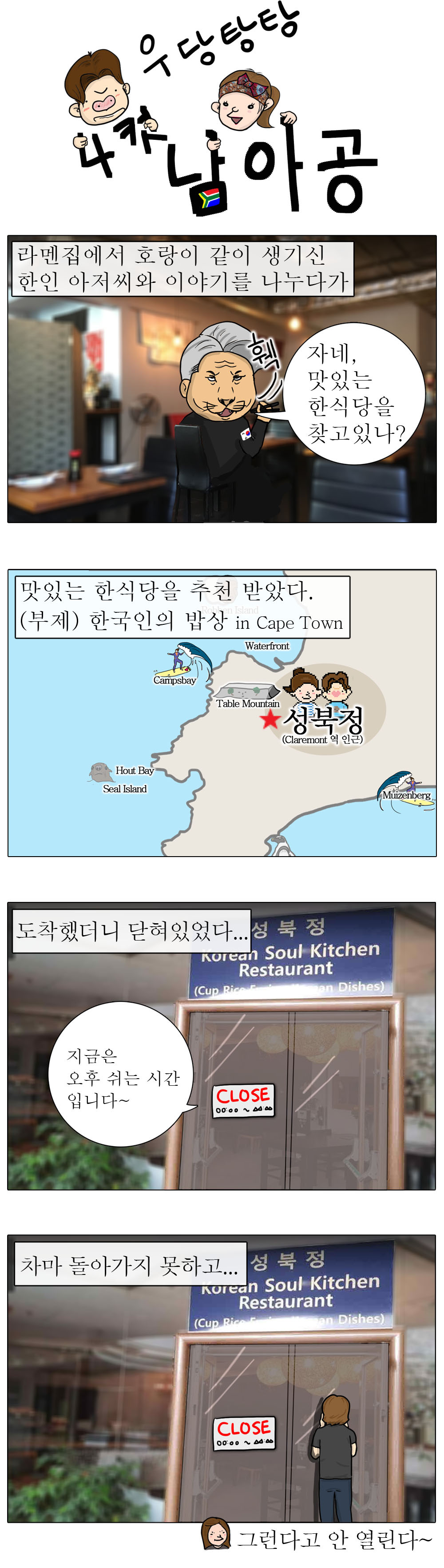 그래서 더더욱이 케이프타운에서는 꼭 한식을 먹겠노라 다짐했지만 생각만큼 쉽게 찾지 못하고 있었다. 구글 지도로 잘 검색이 되질 않았다. 그러다가 일본 라멘 집에서 우연히 만난 한인 아저씨께 식당을 추천받았다. 그 아저씨는 굉장히 호랭이 같은 인상에 소매에는 태극기가 붙어 있었는데 남아공 한인 사회에서 꽤나 높은 분이셨던 것 같다.