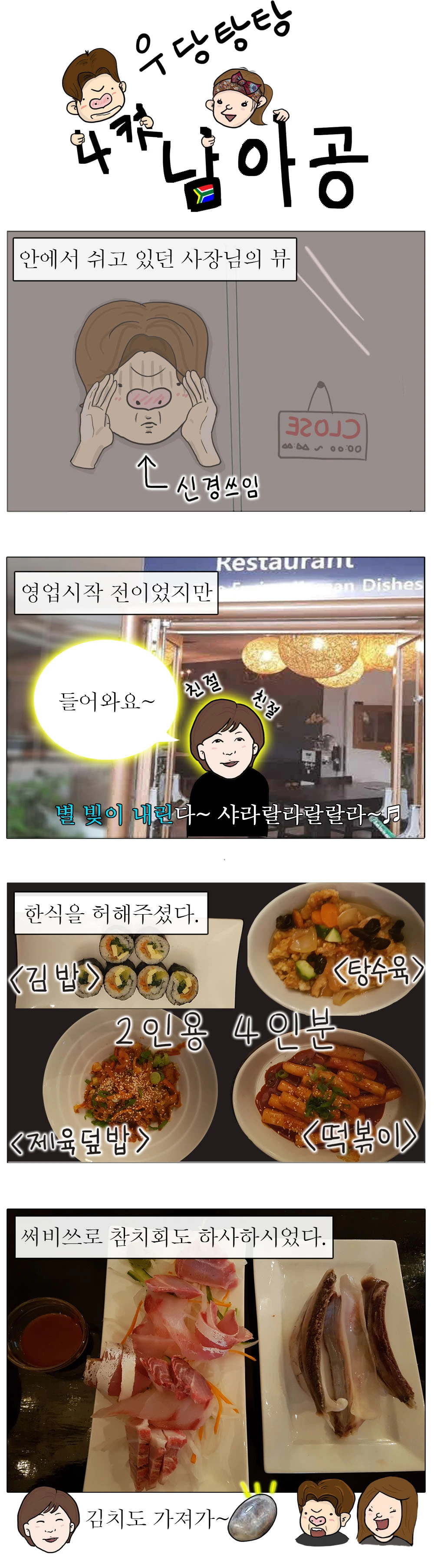 참치까지 다 먹은 후 이제 가려는데, 사장님이 이번에는 김치를 팔뚝만 하게 포장해 주시는 게 아닌가.. 그동안 먹어온 통조림으로 파는 유사 김치가 아니라, 직접 담근 리얼 한국 김치였다. 남아공에서 한국 배추, 고춧가루, 액젓 등이 얼마나 구하기 어려운 것인지를 알고 있었기 때문에 이것도 참치만큼이나 귀한 것임을 알 수 있었다. 김치는 돌아온 후에도 한참을 맛있게 먹고 국물까지 김치볶음밥으로 뚝딱했다.
