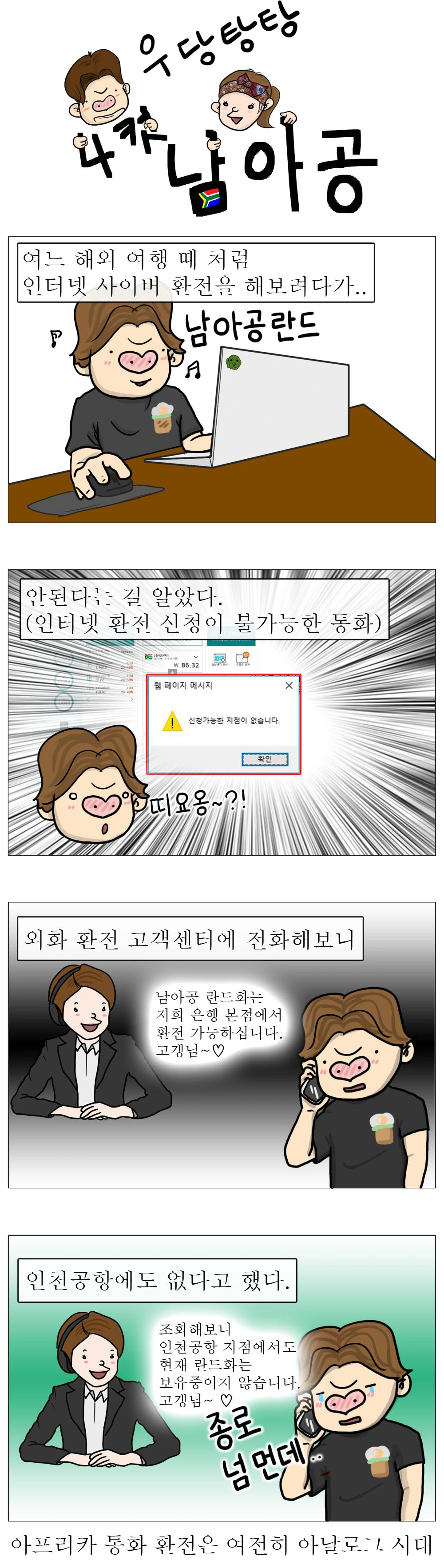 나 역시 아프리카행은 처음이었던지라 사이버 환전부터 시도했었다. 하나은행 사이버 환전 사이트에서는 메인 화면에 남아공 란드화가 안내되고 있지만 막상 진행하다 보면 만화처럼 실패하고 만다. 그럼 왜 메뉴에 있는 것일까? 아마도 보유 지점이 있을 때도 있고 없을 때도 있어서 그런 것 같다.