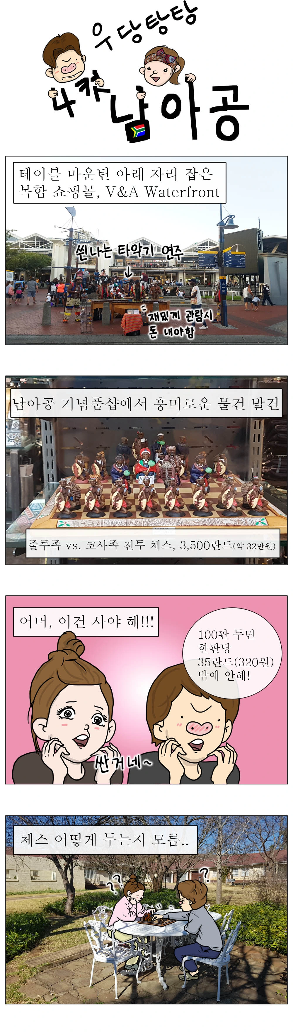 우리 부부는 해외여행 기념품에 욕심을 좀 내는 편인데, 거창한 것은 아니고 방문지마다 그 지역의 특색을 담은 자석을 모으고 있다. 케이프타운과 남아공을 기념하는 자석을 찾다가 우연히 발견한 것이 바로 위의 체스. 체스 말을 남아프리카 부족인 줄루(zulu)족과 코사(xhosa)족으로 꾸민 것이었다. 줄루족은 남아공 인구 중 가장 많은 비중을 차지하는 부족이고, 코사족은 규모는 작지만 넬슨 만델라를 배출한 또 다른 남아공 내 흑인 집단이다. 줄루족이 대승을 거둔 실제 전투를 배경으로 제작된 특이한 체스 세트에 꽂혀 버렸다.