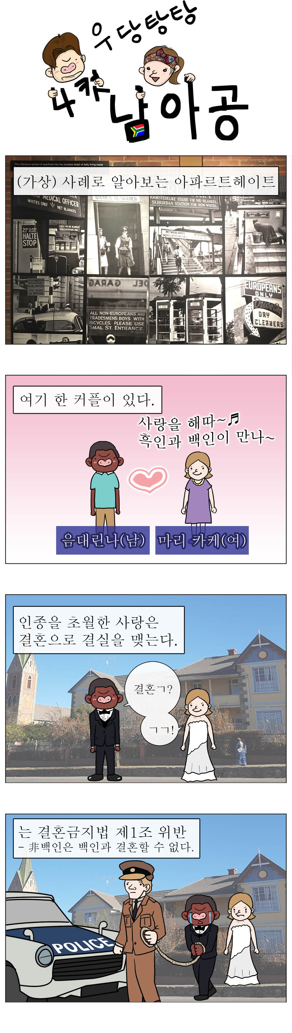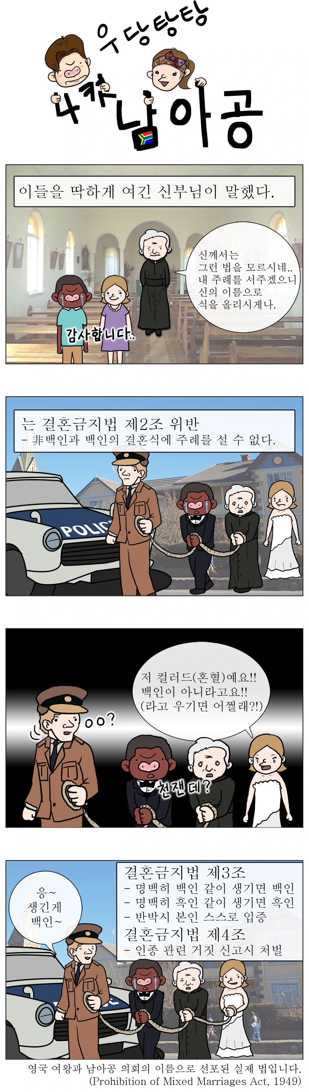 그중 하나의 큰 축을 담당하는 것이 바로 결혼금지법이다. 영문 법안명은 Prohibition of Mixed Marrages Act. 제대로 번역하면 혼혼(混婚)금지법이 맞을지도 모르겠다. 이 법은 이름처럼 백인(Europeans)과 非백인(Non-Europeans)간의 결혼을 금지한다.