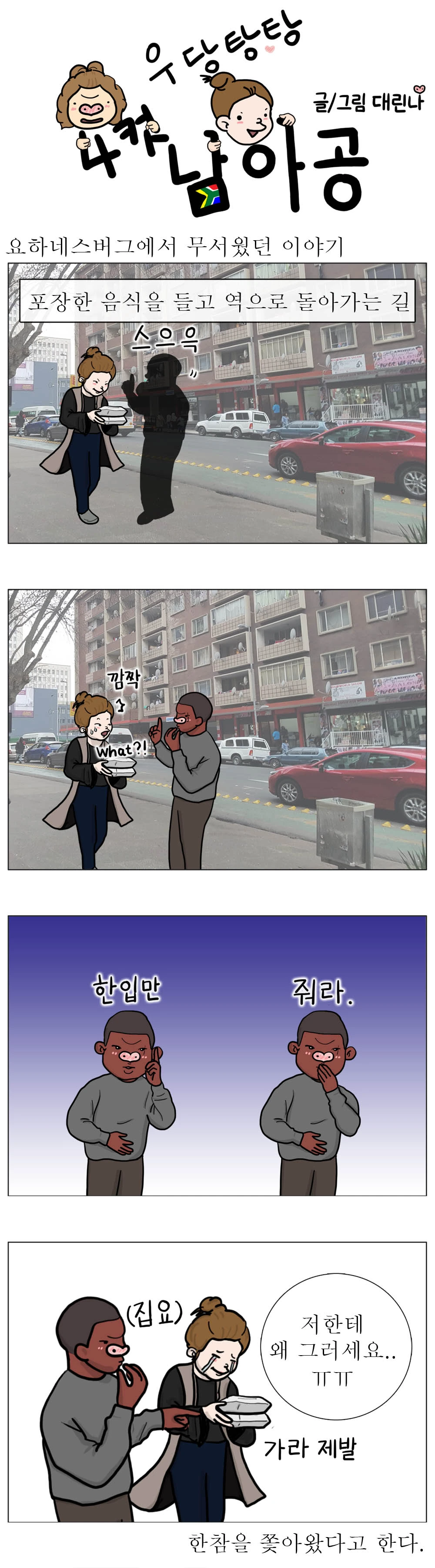 Neighbourgoods Market에서 포장해온 한식을 들고 파크역으로 돌아가는 길이었다. 조벅 센트럴 구역에 있는 그 길은 사실 굉장히 치안이 좋지 않은 곳이라고 듣긴 했다. 그래도 Neighbourgoods Market이 있는 곳이고, 한낮이기도 했으니 괜찮겠지 했다. 그리고 코리안 비비큐 사장님께서 비닐봉지가 없는데 괜찮겠냐고 물으셨을 때도 진짜 괜찮을 줄 알았으나..