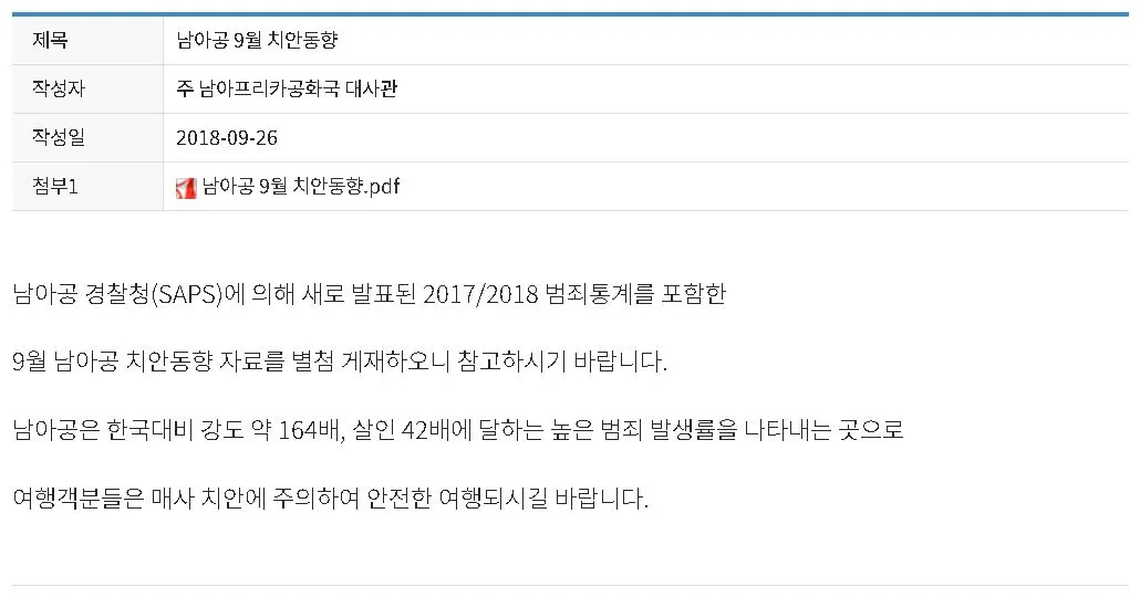 주남아공 우리나라 대사관에서 공지한 치안 동향 문서 확인하기.