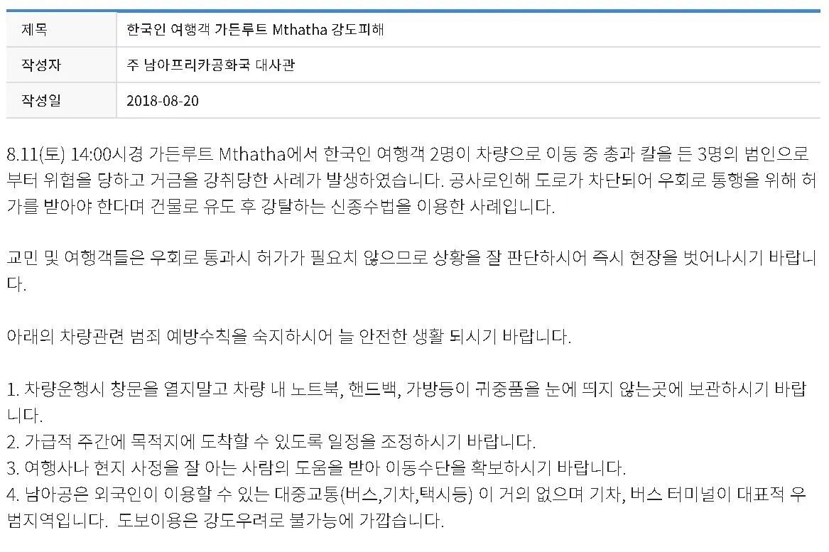 이번에 소개할 사건 또한 교묘하게 상황을 연출한 후 순간 강도로 돌변한 케이스로 2018년 8월, 남아공 이스턴케이프州 음타타에서 한국인 관광객을 대상으로 벌어진 사건이다. 범인들은 공사로 인해 막힌 도로를 우회하기 위해서는 통행 허가가 필요하다는 이유로 운전자에게 하차를 유도하고, 건물로 데려가 물품을 강탈했다.