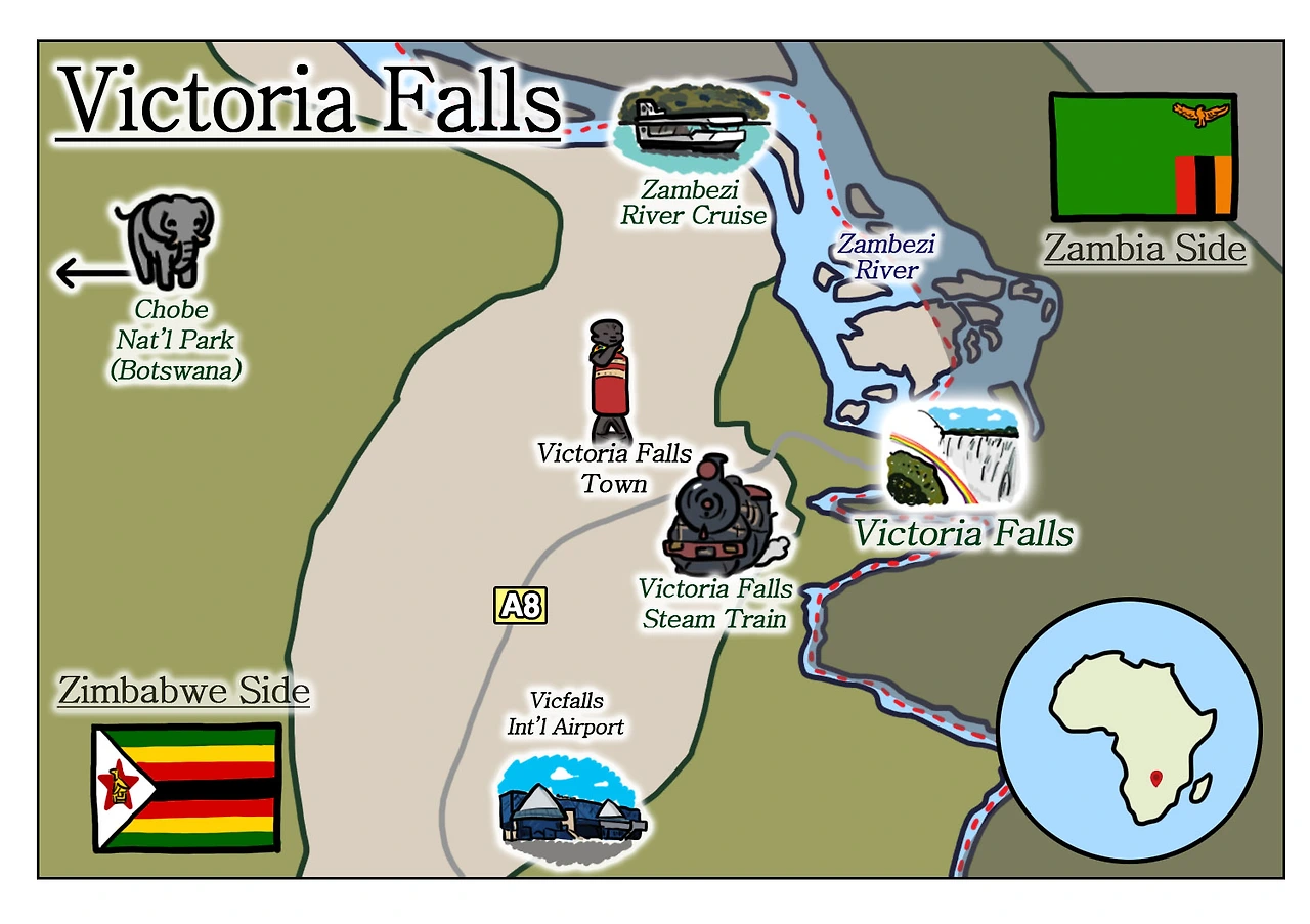 자동차로 15분 정도 달리니 아프리칸 마사지로 유명한 자갈밭길에 들어섰고 곧 선착장이 나왔다. 지도상으로 선착장들은 빅폴보다 한참 위쪽에 있어서 크루즈 안에서는 빅폴이 보이지는 않는다. 저 멀리 피어오르는 물안개가 빅폴이라고 짐작만 할 뿐이다. 나이아가라 폭포처럼 배에서 폭포를 바라보는 광경을 떠올리고 간다면 조금 실망할지도 모른다.