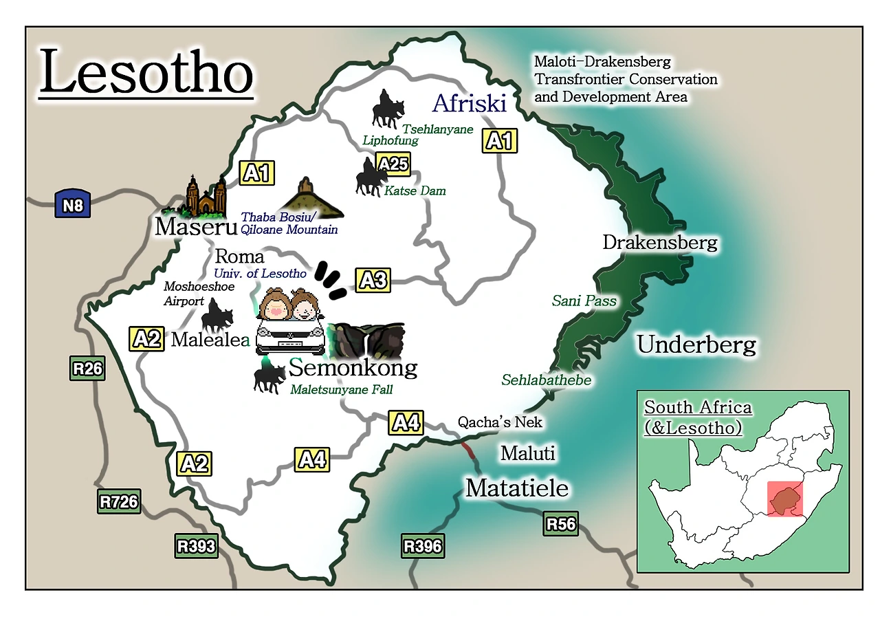 ㅇ가는 방법 : 국제공항이 하나 있지만, 비용, 시간을 고려할 때 요하네스버그에서 육로로 이동하는게 가장 편하다. 더반에서 출발할 때는 카차스넥(Qacha's Nek)이나 사니패스(Sani Pass, 4륜 자동차) 국경 쪽으로.