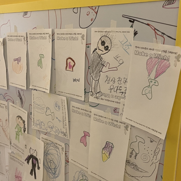 전시의 마지막에는 앤서니 브라운이 즐겨했다는 '세이프 게임'을 체험할 수 있는 공간도 마련되어 있다. 같은 형태의 선이 그려진 종이에, 관람객 각자의 상상력을 더해 완성한 그림들이 한쪽 벽면을 가득 채운다.
