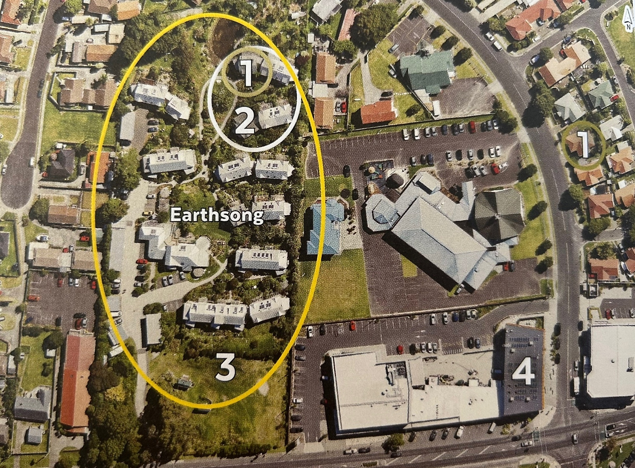 영속농업(Permaculture)에서 사용하는 Zoning의 개념을 반영해 아래 사진과 같이 Zone 1(내 집과 공용 채소 정원), Zone 2(내 집 주변 이웃 클러스터 포함 6~8 가구), Zone 3(어스송 에코빌리지 커뮤니티 전체로 커뮤니티 하우스 관리, 정원, 커뮤니티 행사 등 공공공간까지 포함된 개념), Zone 4(에코빌리지 인근 도로, 지역 도서관, 상점, 커뮤니티 시설 등 포함)로 구분하고 Zone 별로 각자의 역할과 책임을 구분해 원활하게 에코빌리지 커뮤니티가 운영될 수 있도록 함.