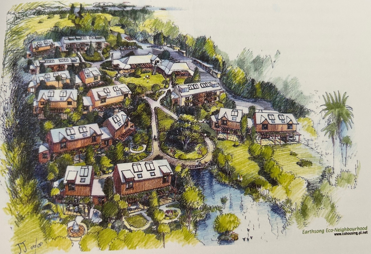 둘째 날, 워크숍 강사인 로빈이 살고 싶은 코하우징 커뮤니티를 A4 용지에다 사인펜과 색연필로 직접 디자인해 보는 실습을 제안했습니다. 저는 지금과 달리 그 당시 에코 빌리지 커뮤니티를 만들겠다는 커다란 꿈과 목표를 가지고 워크숍에 참석한 게 아니라서 하얀 백지를 앞에 두고 턱을 괸 채 조용히 고민에 빠졌습니다. 잘 모르겠어서 우선 내가 살고 싶은 집의 조건을 생각해 보기로 했습니다. '숲이 있으면 좋겠지?' 집들은 프라이버시 존중을 위해 간격을 좀 띄우고. 타우랑가처럼 테라스에서 호수가 보일 수 있다면 멋질 거야. 뉴질랜드는 물가가 비싸니까 식량자급률을 높이기 위해 채소 정원과 과일나무들을 심어보자. 주차장은 어디로 정하면 좋을까? 커뮤니티 하우스에는 어떤 기능이 필요하지? 에코빌리지에 몇 가구가 함께 살면 좋을까? 어스송 에코빌리지는 너무 큰데… 그러다가 갑자기 저의 최애 애니메이션인 "빨강머리 앤"의 초록색지붕집이 떠올랐습니다. 앤의 방에서 창밖으로 보이는 '눈의 여왕'이란 이름의 사과나무, 베프 다이애나와의 약속 장소인 자작나무길, 반짝이는 호수 등등. 슥슥슥 사인펜으로 그림을 그리기 시작했고 어느새 미래형 작은 에코빌리지 초안이 조금씩 모습을 드러냈습니다.