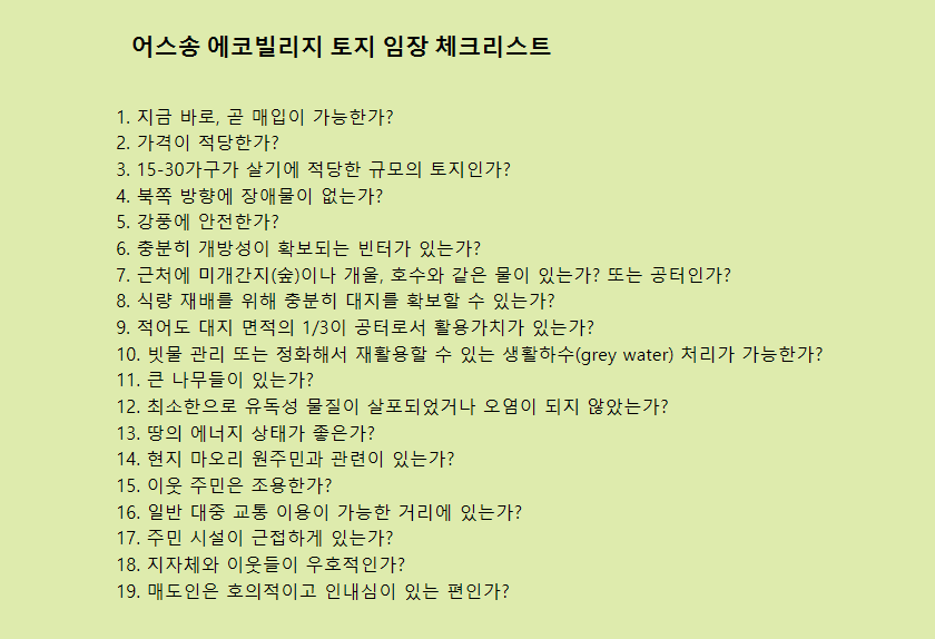 워크숍 강사인 로빈에 따르면 어스송 에코빌리지는 프로젝트 초반부터 친환경적인 에코빌리지의 지속가능성측면을 우선순위에 두고 진행했다고 합니다. 그래서 이름도 Earthsong eco-neighborhood 예를 들어 토지 '임장 활동(현장조사나 부동산답사를 다니는 것)'을 할 때부터 아래와 같이 체크리스트를 만들어 매물을 평가했다고 합니다. 특히 인상적인 부분은 5. 강풍 안전, 8. 식량 재배용 대지 확보 10. 빗물 관리 등 하수 처리, 11. 큰 나무들 식재 여부 12. 유독성 물질이나 오염 정도 13. 땅의 에너지 등과 같이 환경적이고 지속가능적인 요소를 크게 반영했다는 점이었습니다. 이런 부분은 저도 앞으로 임장 할 기회가 된다면 참고해야겠습니다.