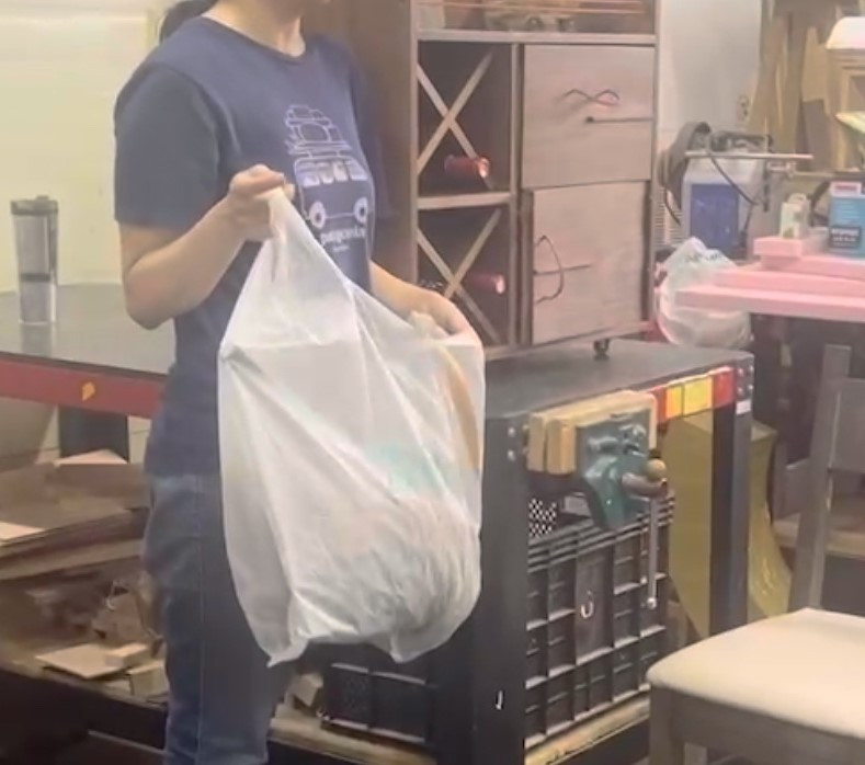 작품을 제작할 때 환경에 대해 신경을 쓰지 않을 수가 없었는데요. 액자와 스툴을 만들면서 나중에 쓸만한 사이즈가 되는 목재는 바구니에 모아두고 있지만 찌끄레기들은 기계실에서 작업을 하고는 바로 목재 쓰레기통에 버립니다. 이번에 캐비닛을 만들면서 내가 얼마나 나무 쓰레기를 배출하는지 알아보려고 마음먹었습니다. 그래서 비마트에서 받은 커다란 비닐을 작업대 옆에 걸어두고 나무 쓰레기를 꼼꼼하게 모으기 시작했습니다.