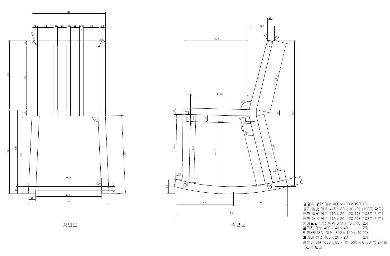 그래서 고충실도로 확정한 치수를 캐드로 그렸습니다. 원목으로 작업하는 과정에서 헤매지 않도록 수치를 꼼꼼하게 작성하려고 신경을 썼습니다.