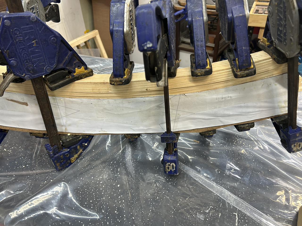 준비가 다 됐으면 우선 애쉬를 비닐 위에 나열하고 물과 섞은 본드를 먼저 베이스처럼 룰러로 발라준 뒤에 본드를 핫도그 위에 케첩 뿌리듯 꼼꼼하게 뿌려줍니다. 그다음 번호에 맞춰 각각 짝을 맞춰 덮어주고 본드 작업을 동일하게 반복합니다. 애쉬를 양 사이드가 일자로 반듯하게 맞춰주면 후가공 작업이 수월할 수 있어요. 이제 지그에 대고 클램프로 천천히 꽉 조여줍니다. 젖은 타월로 흐르는 본드를 닦아주면 끝. 이렇게 이틀에 걸쳐 두 번 작업을 진행해 밴딩을 2개 만들었습니다. 첫날 한 것보다 역시나 둘째 날 작업물이 깔끔하게 나오더라고요. 수압대패로 옆을 다듬고 스크래퍼로 정성스럽게 탄 자국과 본드 자국을 제거해서 흔들 부분을 마무리했습니다. 길이는 나중에 조립한 뒤에 자르려고요. 건식 밴딩 작업은 건식 밴딩 경험이 있는 분과 2인 1조로 해보니 수월했고 결과물도 예상대로 잘 나왔습니다. 부드럽게 흔들리는 동일한 사이즈의 두 개의 밴딩 결과물을 보며 마음 뿌듯했습니다. 이제 진짜 흔들의자를 만드는구나 실감이 나네요.