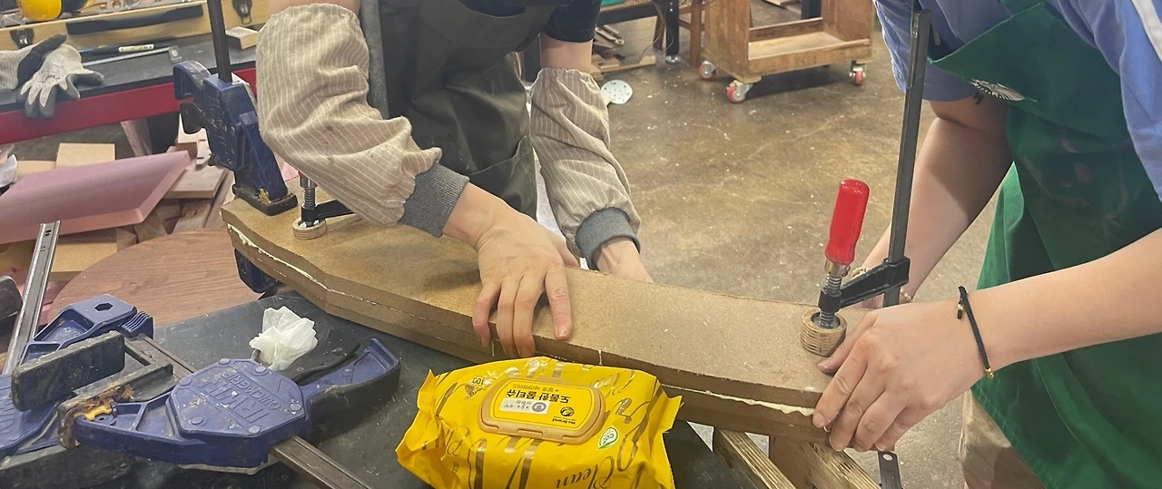 흔들의자는 의자가 잘 흔들려서 기분이 좋아지는 게 핵심인데요. 고충실도 작업을 할 때 밴드쏘로 선 따라 자르고 벨트 샌더로 다듬었는데 앉아보니 덜그럭 거리는 느낌이 들어서 거슬렸습니다. 그래서 새롭게 건식 밴딩에 도전해 보기로 했습니다. 동료가 먼저 작업하는 것을 보면서 할 수 있겠다 싶더라고요. 습식밴딩의 경우, 지그를 대더라도 각도 조절이 원하는 대로 나오지 않을 수 있고 일주일이나 걸리는 반면, 건식밴딩은 본드로 고정 가능하고 하루 만에 결과가 나오는 장점이 있었습니다. 한마디로 말해 건식 밴딩이 좀 더 만만해 보였다고 할 수 있죠.