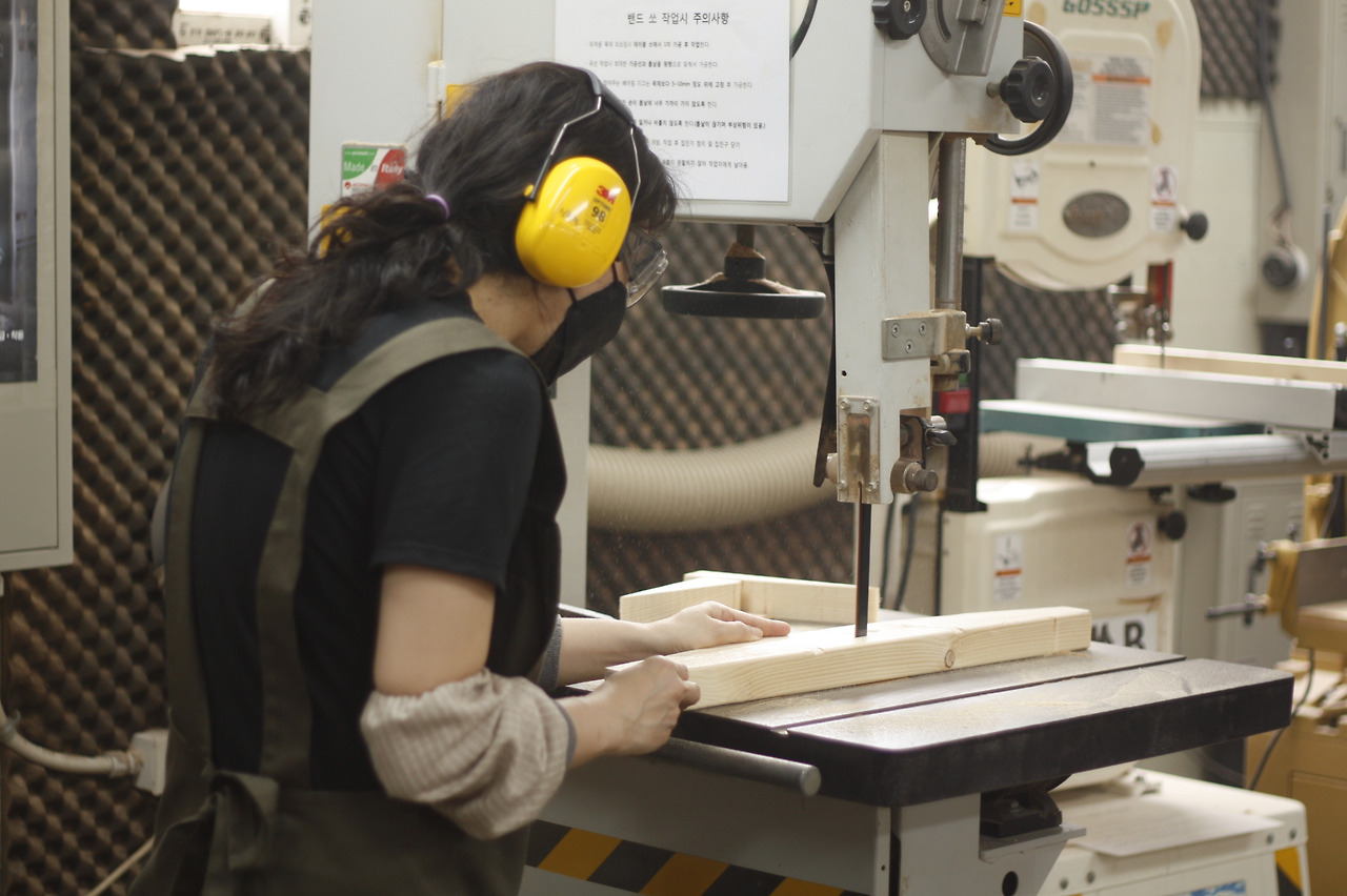 돌아보면 과정을 통해서 얻은 혜택이 정말 많은데요. 우선 전동드릴을 어떻게 쓰는지 알게 됐습니다. 수압대패, 자동대패, 테이블쏘, 슬라이드쏘, 밴드쏘, 각도절단기, 각끌기, 드릴 프레스, 벨트 샌더, 드럼 샌더와 같은 기계의 사용법을 익혔습니다. 메꾸미를 하는 방법, 연귀, 사개맞춤, 주먹장 등 암장부와 숫장부를 따는 방법, 도면을 읽는 방법, 집성하는 방법, 리쏘잉 방법, 도미노 사용 방법, 클램프로 조이는 방법, 쫄대 만드는 방법, 하드웨어(손잡이, 3단 레일, 숨은 경첩, 나비경첩, 다보) 설치 방법, 무늬목을 바르는 방법, 건식 밴딩 방법, 서랍 제작 방법도 배웠지요. 또한 캐드 프로그램을 사용할 수 있고 모델링과 렌더링을 위한 스케치업과 GIMP 프로그램도 기본적인 기능도 익혔습니다. 무엇보다 이렇게 나열한 방법들의 결정체인 가구디자인 및 제작 전 과정을 경험할 수 있었습니다. 레퍼런스를 찾고 작도법을 이용해 스케치를 한 다음 미니어처를 만들고 캐드 도면을 그린 후 목취도와 저충실도, 고충실도를 만들고 나뭇결무늬를 고려해 나무를 재단하는 제작 공정까지 빠르게 반복해서 습득했습니다. 이 모든 게 새로웠지만 그래도 뒤처지지 않고 열심히 잘 따라갔다고 스스로 평가하고 싶습니다.