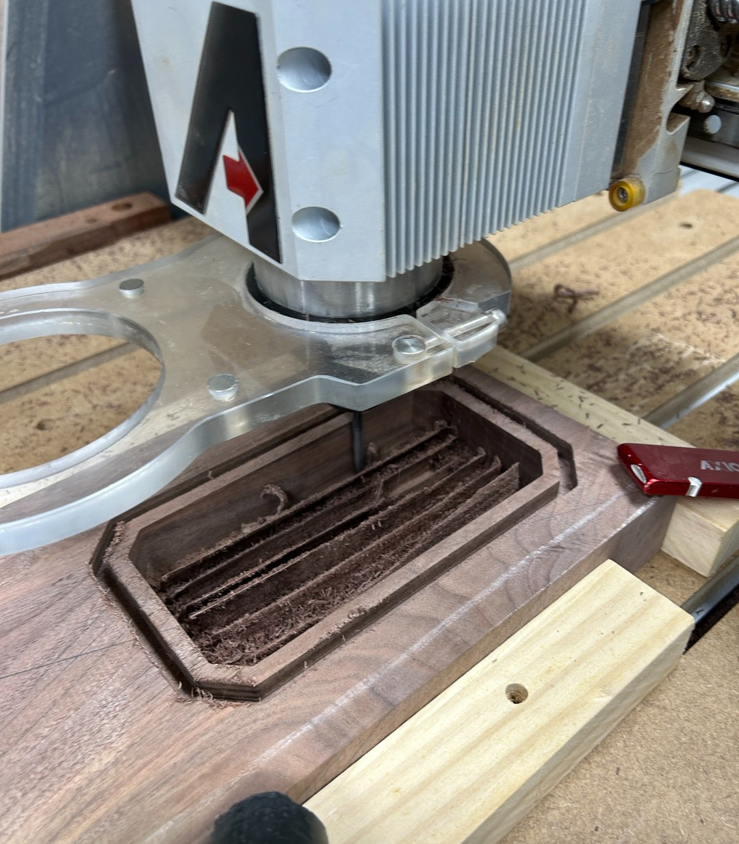 먼저 월넛을 기계에 제대로 고정하고 CNC 프로그램 파일을 열어 X, Y, Z 측을 원점 세팅해 준 뒤 Start!
