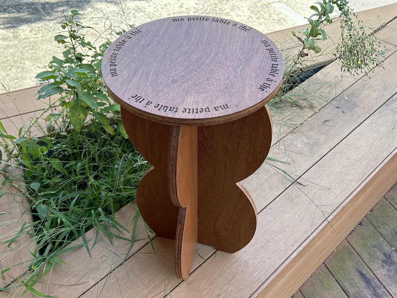 드디어 제 차례가 되어 기계에 USB를 꽂아 파일을 설정하고 X축과 Y축 원점을 맞춰준 후 엔드밀을 번호를 확인한 뒤에 시작 버튼을 눌렀습니다. 큰 CNC 기계의 장점은 진공으로 합판을 고정시켜 주기 때문에 클램프로 고정시켜 줄 필요가 없다는 점이었습니다. 대략 1시간 40분 정도의 시간이 소요됐고 별다른 문제없이 작업이 완료됐습니다. 이제는 샌딩과 도장 작업 차례인데요. 역시나 색상 측면이나 완성도 측면에서 라왕 합판 특유의 애매모호함이 느껴졌습니다. 그래서 150방, 220방, 400 방 샌딩을 해준 다음 상판에 레이저로 각인을 해보기로 결정했습니다. 제2외국어였던 프랑스어 실력을 살려서 나의 작은 티테이블이란 의미로 ma petite table à thé를 각인하기로 했는데요. 역시나 있어 보이게 Old English Text MT 폰트를 선택했습니다.