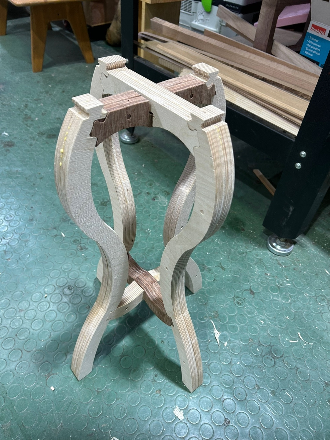 작은 CNC 기계에 합판을 고정시키고 도면대로 모양을 따냈습니다. 특히 상판의 경우 앞뒤로 양면 가공을 해야 했는데 연필로 바닥에 위치를 표시한 뒤 윗판에는 90도 각도의 V 엔드밀을 이용해 파도 선을 구현했고 뒤판에는 다리 장부 4개를 파고 동그랗게 커팅을 진행했습니다. 간단히 샌딩을 해주고 목공용 본드를 발라 아래와 같이 조립을 완성했습니다. 두 가지 다른 굵기의 합판이라 그런지 보강대의 반턱 조립이 딱 맞지 않더라고요. 그래서 밴드쏘로 공간을 좀 더 넓혀 주었습니다. 이뿐 아니라 캐드와 미니어처 작업 때는 몰랐는데 위에서 내려보는 각도로 아래 사진처럼 바라보니 머리가 크고 다리가 짧아 보여 디자인 측면에서도 개선이 필요해 보였습니다. 그래서 다리 라인을 다시 그려 캐드에서 수정한 도면을 Aspire 프로그램에 반영했습니다.