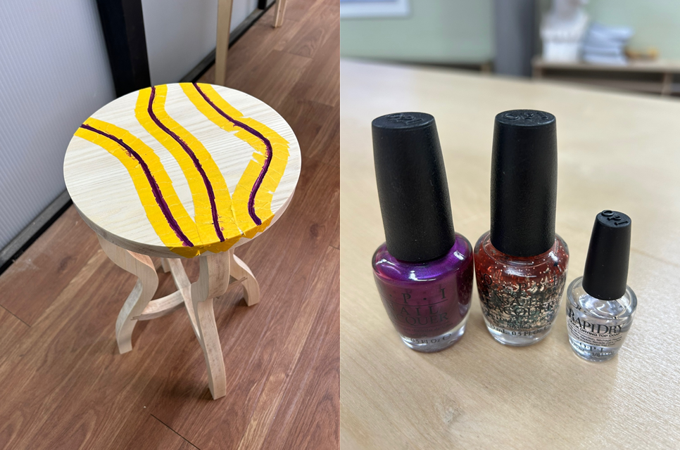 상판의 물결무늬 부분에 색상은 조금 더 특별한 재료를 실험적으로 사용해보고 싶었습니다. 레진을 사용하기에는 크기도 작고 사용하는데 조금 부담스러웠거든요. 그래서 사놓고 쓰지 않는 매니큐어를 이용해 보기로 했습니다. 우선 탑코트로 주변에 번지지 않도록 무늬 가장자리에 먼저 발라주고 노란색 종이테이프를 꼼꼼하게 붙였습니다. 그리고 소장하던 매니큐어 자주색과 투명 글리터를 여러 차례 발랐습니다. 건조한 후에는 탑코트를 발라 광택을 냈고요. 그 외 부분에는 반광 바니쉬를 정성껏 발랐습니다. 바니쉬는 코팅 성격이 강해서 건조 속도가 빠르고 황변이 일어나지 않습니다. 동료에 따르면 나무를 보호하려면 기본적으로 오일을 발라줘야 한다고 했지만 애쉬가 누렇게 변하는 건 원치 않아서 저는 바니쉬를 선택했습니다. 순전히 개인 취향이죠. 2차 샌딩은 320방과 400방으로 2차 샌딩 후 바니쉬 추가 도포, 600 방으로 3차 샌딩 후 바니쉬 도포로 최종 마무리했습니다.