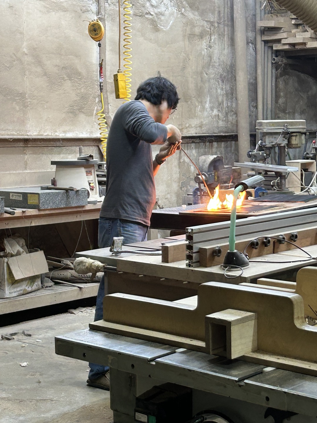백만기 선생님께서 환한 미소로 저희 일행을 반갑게 맞아주셨고 자유롭게 투어를 할 수 있도록 안내해 주셨습니다. 여기선 이제 단체 교육은 하지 않고 개인 맞춤 교육만 진행하신다고 하시더라고요. 평일 낮이어서 그런지 작업대들이 대부분 비어있었지만 열심히 작업하고 계신 분들도 계셔서 멀찍이 이 분들의 작업을 지켜보기도 했습니다. 곳곳에 작업대들이 설치되어 열쇠 공방처럼 오롯이 자기 작업에 몰두할 수 있게 보였습니다. CNC를 비롯해 다양한 목공 기계를 사용할 수 있는 기계실도 있었고 심지어 낙동(오동나무 겉을 인두로 지지는 작업)이 가능한 장소도 있었으며 샌딩, 도장하는 공간 등 기존의 교육 공방을 넘어선 좀 더 프로페셔널하게 조성된 공방의 모습이 인상적이더라고요.