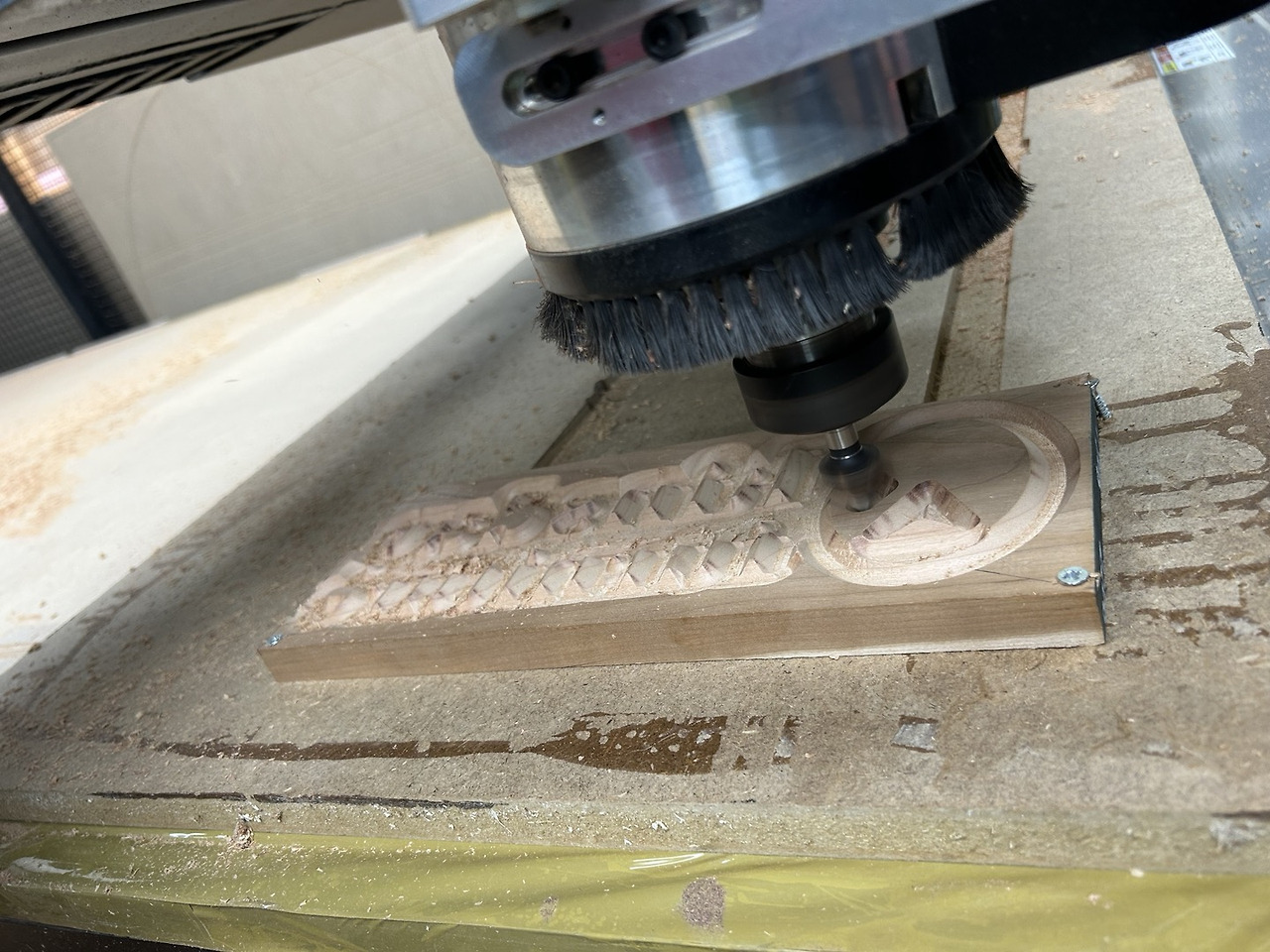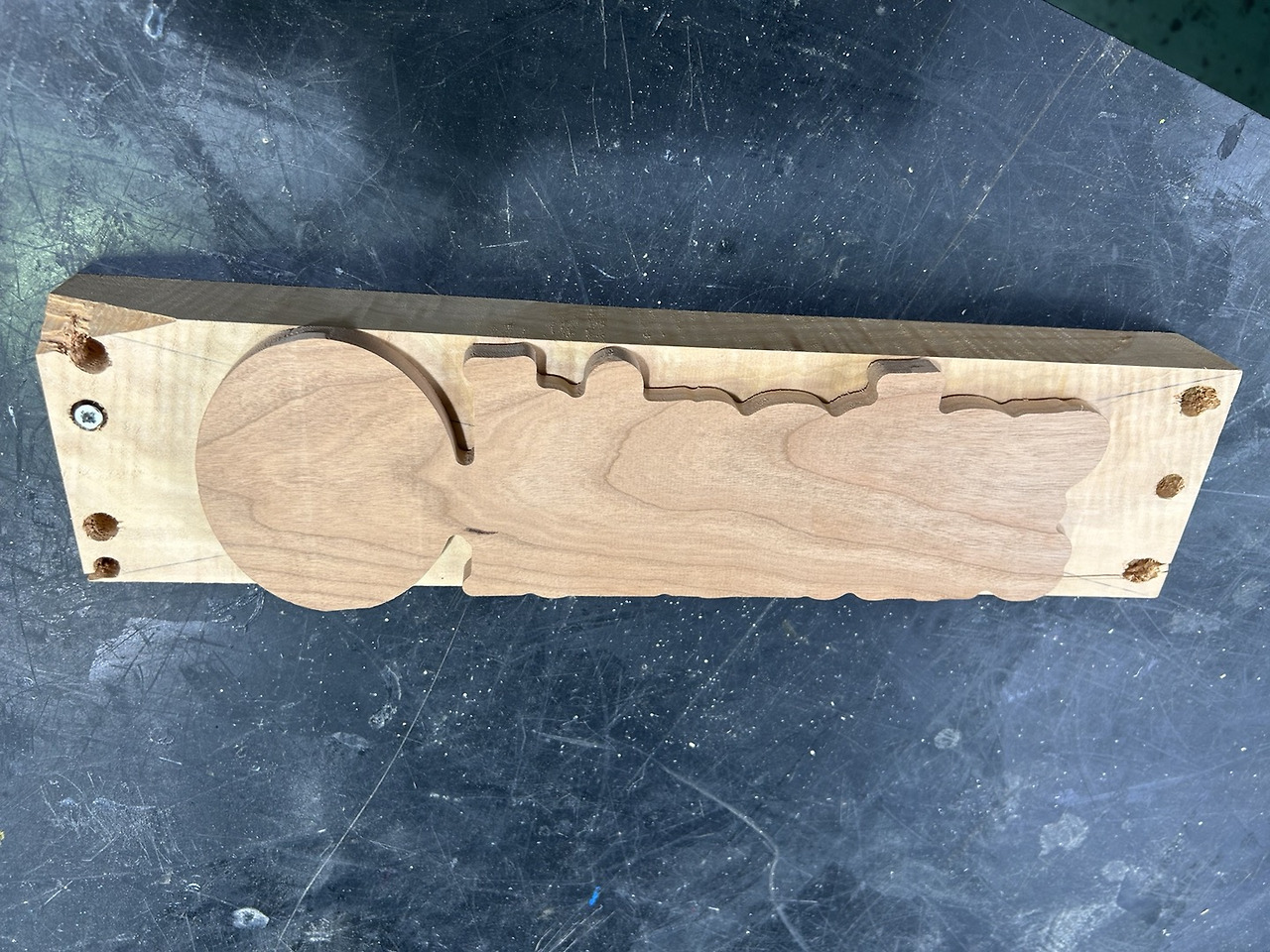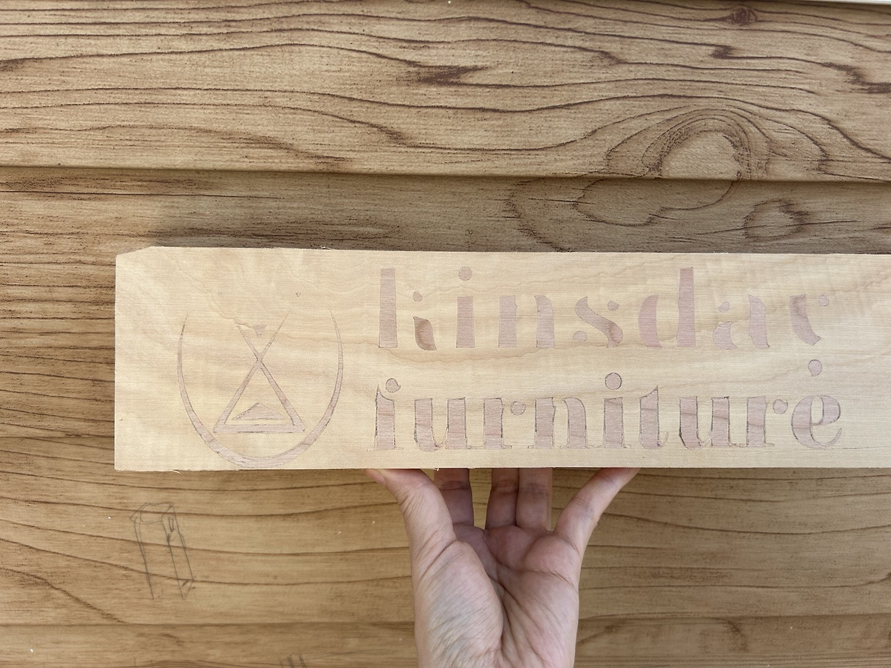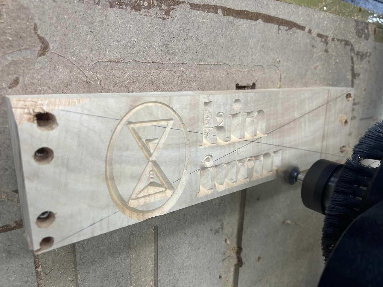 양각의 공구경로 설정이 좀 까리했지만 해볼 만하다고 판단되어 재빠르게 aspire 프로그램을 이용해 음각 디자인을 하고 공구경로를 설정했습니다. 모래시계 로고와 "kinsday furniture" 이렇게 글씨를 새기고 싶었습니다. 의도치 않게 대형 CNC를 이용하게 되어 드릴로 박아 목재를 고정시켜야 했는데요. 나무 두께도 있고 나무 사이즈도 제약이 있는 데다가 드릴 사용이 아직 익숙지 않은 상황이라 심리적 압박이 있었습니다. 드릴을 너무 빠르게 박아서인지 나무 모서리에 금이 쫙 가는 대략 난감의 상황마저 벌어졌습니다. 다행히 양각은 잘 되었는데 음각을 할 때 드릴 고정이 반듯하지 않아서인지 살짝 각도가 기울어진 상태로 파졌던 것으로 보입니다. 처음엔 몰랐는데 본딩 후 양각 부분을 잘라보니 이러한 문제를 발견했습니다. 어떻게든 살려보고 싶어서 드럼 샌더로 조금씩 갈아냈는데 아뿔싸! 얇게 상감된 부분이 부분적으로 사라져 버리고 말았습니다. 그래서 글씨가 띄엄띄엄 보이더라고요. 각도를 조절한 뒤에 이에 맞게 샌딩을 했어야 했는데 말이죠. 한마디로 실패!