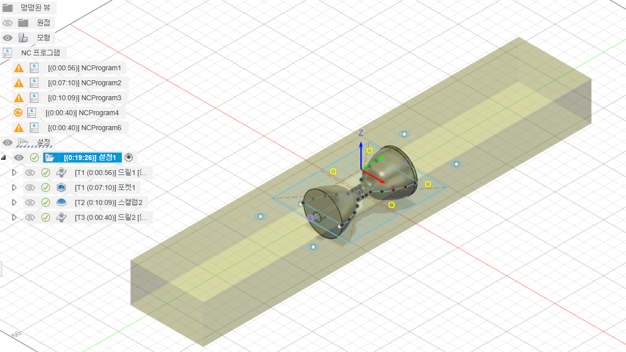 예전에 상감에서 실패했던 모래시계 로고가 마음에 찜찜하게 남았는데요. 그래서 이번 양면 가공 작업에는 모래시계 디자인을 시도해 봤습니다. 윗면과 아랫면이 동일한 디자인이라 작업도 크게 어렵지 않을 것 같았거든요. 게다가 제공받은 나무 사이즈가 아담하기도 했고 CNC 가공 시간도 단축하고 싶어 손바닥에 올려놓을 만한 소형 사이즈가 적합하다고 판단했지요. 80mm x 100 mm x 45 mm로 사이즈를 정한 뒤 퓨전 360 프로그램을 이용해 디자인한 다음 CAM을 짠 뒤 바로 소형 CNC 기계로 직행했습니다. 한 면을 황삭과 정삭으로 작업하고 뒤집어서 윗부분에 2개 아랫부분에 2개, 총 4개의 목다보로 고정시킨 뒤 반대쪽 면을 가공했습니다. 황삭과 정삭을 위해 중간에 비트도 플랫 엔드밀에서 볼 엔드밀로 교환해 주고요. 생각대로 수월하게 작업이 진행됐습니다.