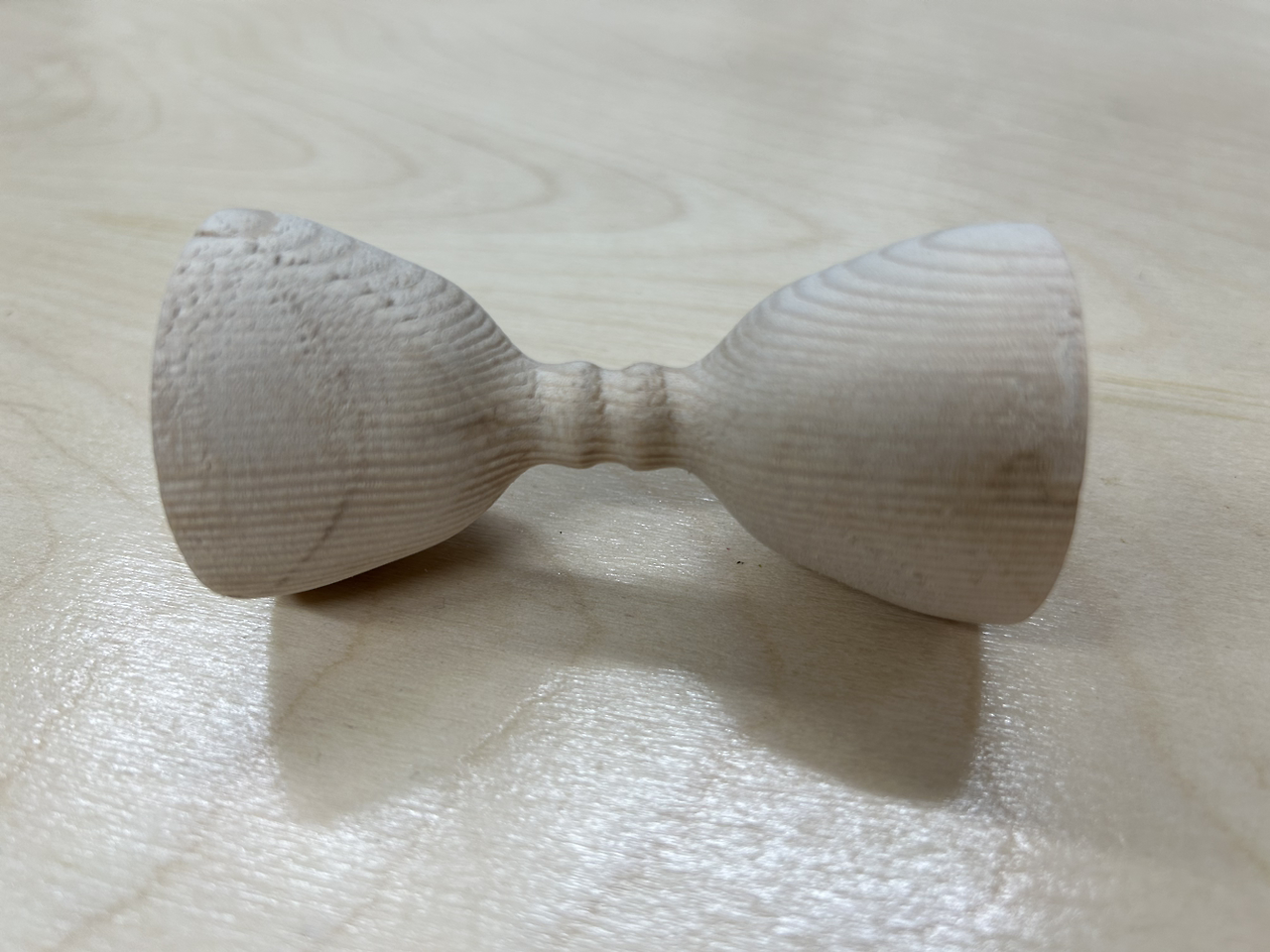 CNC 작업을 마친 뒤 플러그톱으로 탭을 분리시키고 대패 살짝 다듬은 다음 정성스럽게 샌딩 작업을 했습니다. 경험 차원에서 양면 가공을 시도한 것이라 별도로 도장 작업은 하지 않아서 애쉬 특유의 밝은 색감을 간직할 수 있었어요. 오일을 바르면 황변 현상이 생겨서요. 완성품을 보니 모래시계라기보다는 나무로 만든 나비넥타이 같기도 하고 장구 모양 느낌도 나네요. 결과적으로는 공방에 크리스마스트리 장식품으로 매달려 있습니다.