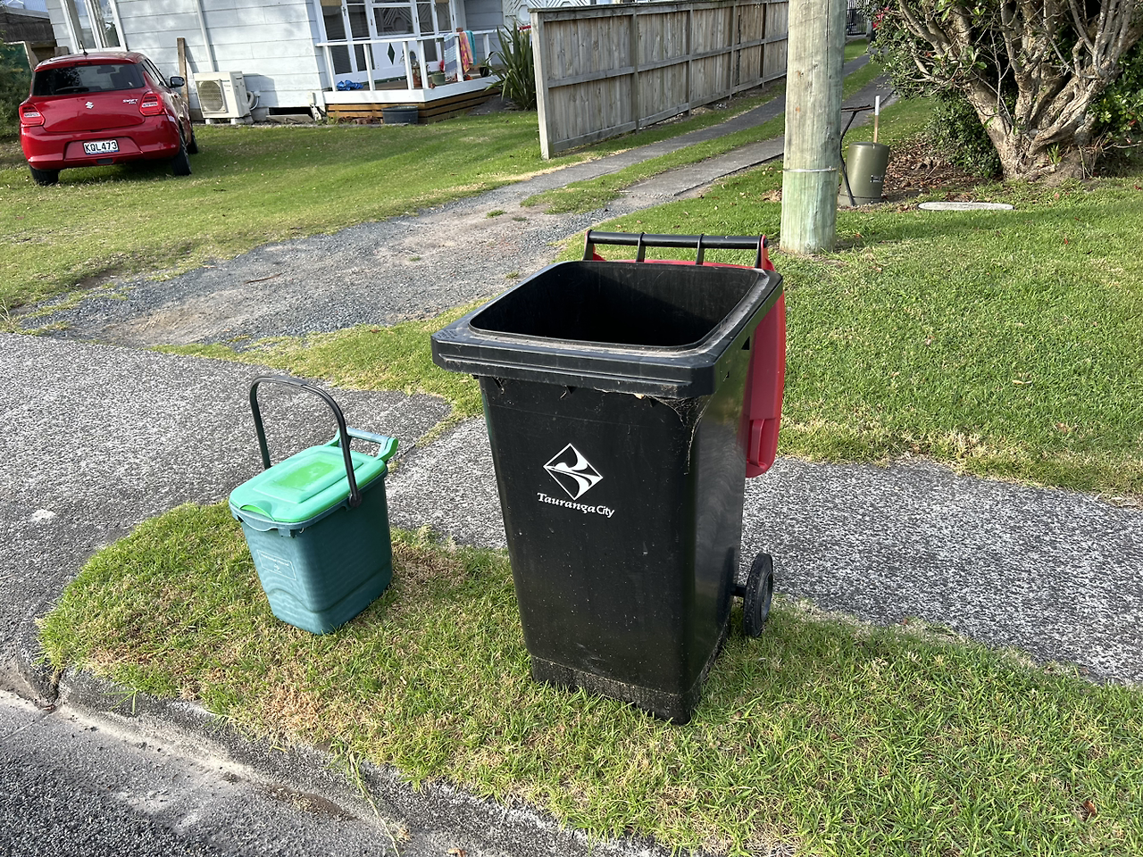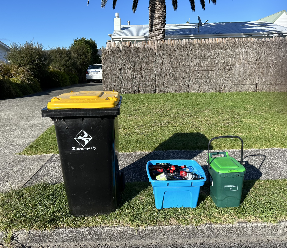 둘째, 가정 별로 쓰레기 수거 정책을 따른다. 내가 머물고 있는 타우랑가에서는 매주 월요일 아침에 동네 주민들이 카운슬에서 지정한 빨간색 뚜껑의 바퀴 달린 일반쓰레기통을 집 밖에 내놓는다. 그러면 환경미화 차량이 와서 차례로 쓰레기통을 기계로 들어 올려 비우고 내려놓는다. 뚜껑이 열려있다는 것은 쓰레기를 수거했다는 뜻이다. 우리나라처럼 100L짜리 비닐봉지를 환경미화원이 직접 손으로 들어 올리다 다치는 일이 없다는 사실이 신기했다. 수거 시간대도 새벽이 아닌 오전 9시에서 11시가량이었다. 어쩌면 노동력이 부족한 나라에서 최적화하고 효율화한 작업 방식이 아닌가 싶다. 재활용품 수거는 격주 월요일 아침에 진행된다. 이때는 노란색 뚜껑이 달린 쓰레기통에 도자기, 플라스틱, 종이, 캔 등 정해진 재활용 쓰레기를 담아 내놓는다. 파란색 플라스틱 바구니에는 병을 모아서 두면 된다. 음식물 쓰레기통은 매주 내다 놓을 수 있다. 카운슬의 공식 홍보 자료에는 쓰레기통들과 바구니를 30cm 간격으로 내놓으라고 이미지와 함께 친절하게 안내돼 있었다.