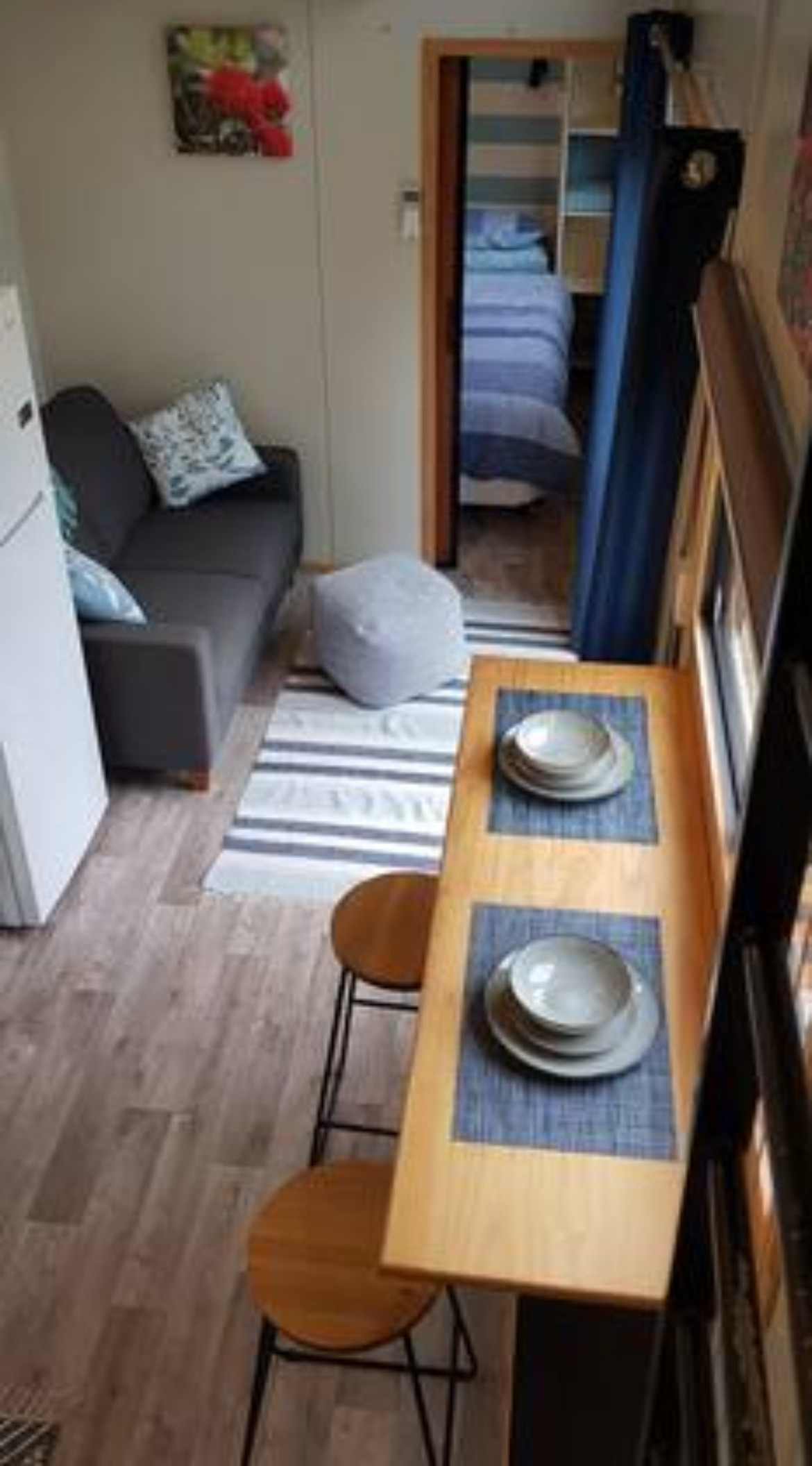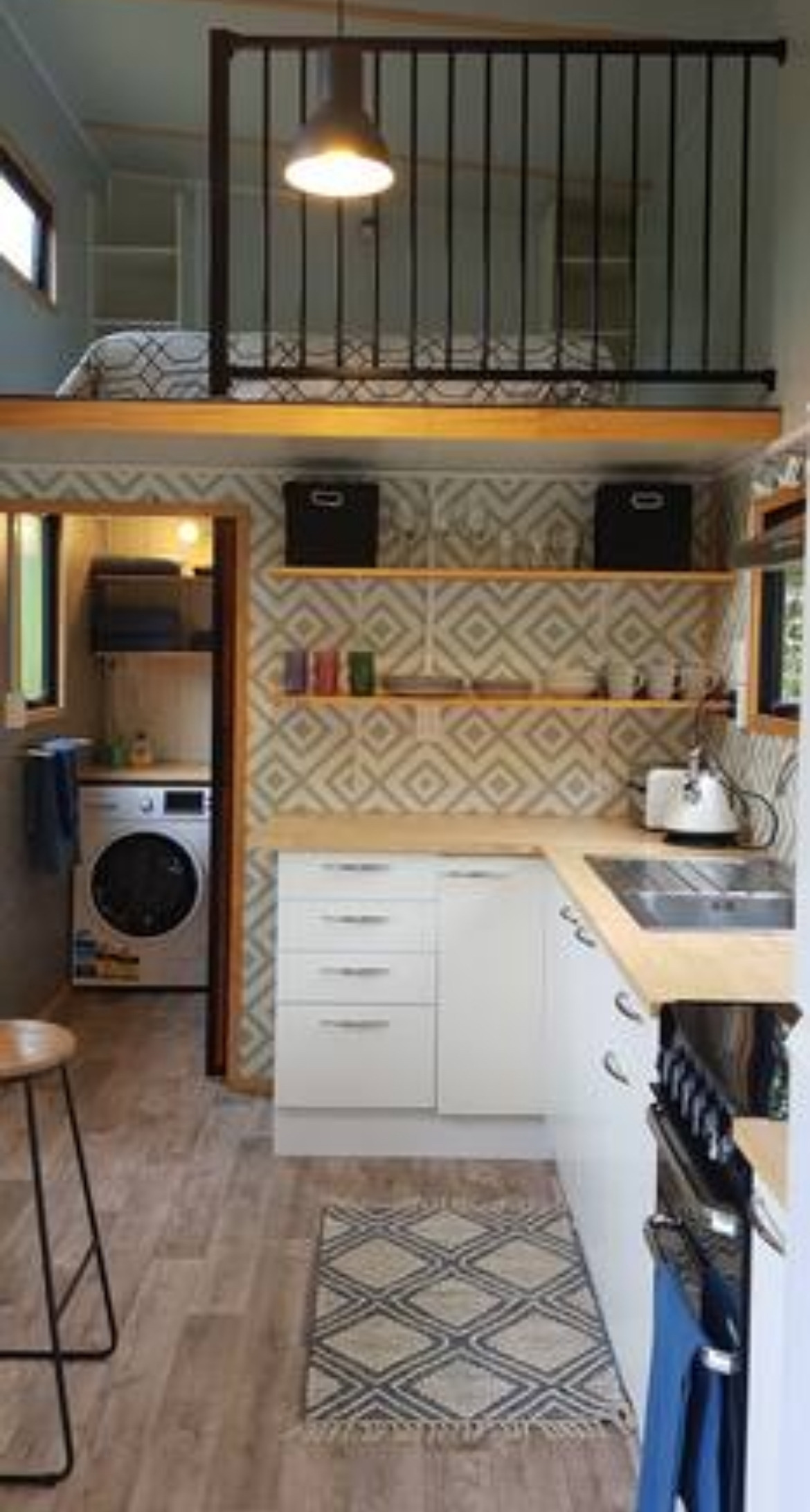 친구와 도착해서 앞마당에 주차를 했다. 이 타이니 하우스는 이동식이 아니라 호스트가 사는 집의 작은 마당을 쪼개어 한쪽에 박아둔 형태였다. 문을 열고 들어가니 바로 부엌과 2인용 소파가 눈에 들어왔다. 부엌에는 오븐도 설치되어 있어 조리가 가능해 보였고 문 옆 바테이블에서는 식사나 PC 업무를 할 수 있는 구조였다. 오른쪽 끝에는 침실이 있고 왼쪽 끝에는 세탁기와 샤워부스, 화장실을 포함한 욕실, 그 위에 사다리를 타고 올라가면 침실이 하나 더 있었다. 최대 3~4인 가족이 지낼 수 있도록 꾸며놓은 느낌이었다.